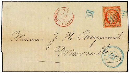 1870 (May 28) Cover to Marseille franked by rare usage of Bordeaux Issue imperforate 40c orange tied by blue 5107 gros chiffres with corresponding Tunis cds in blue below. Red ´Tunis Par Bone-Algerie´ cds at left and arrival cds on reverse of rare cover. Scott 47.