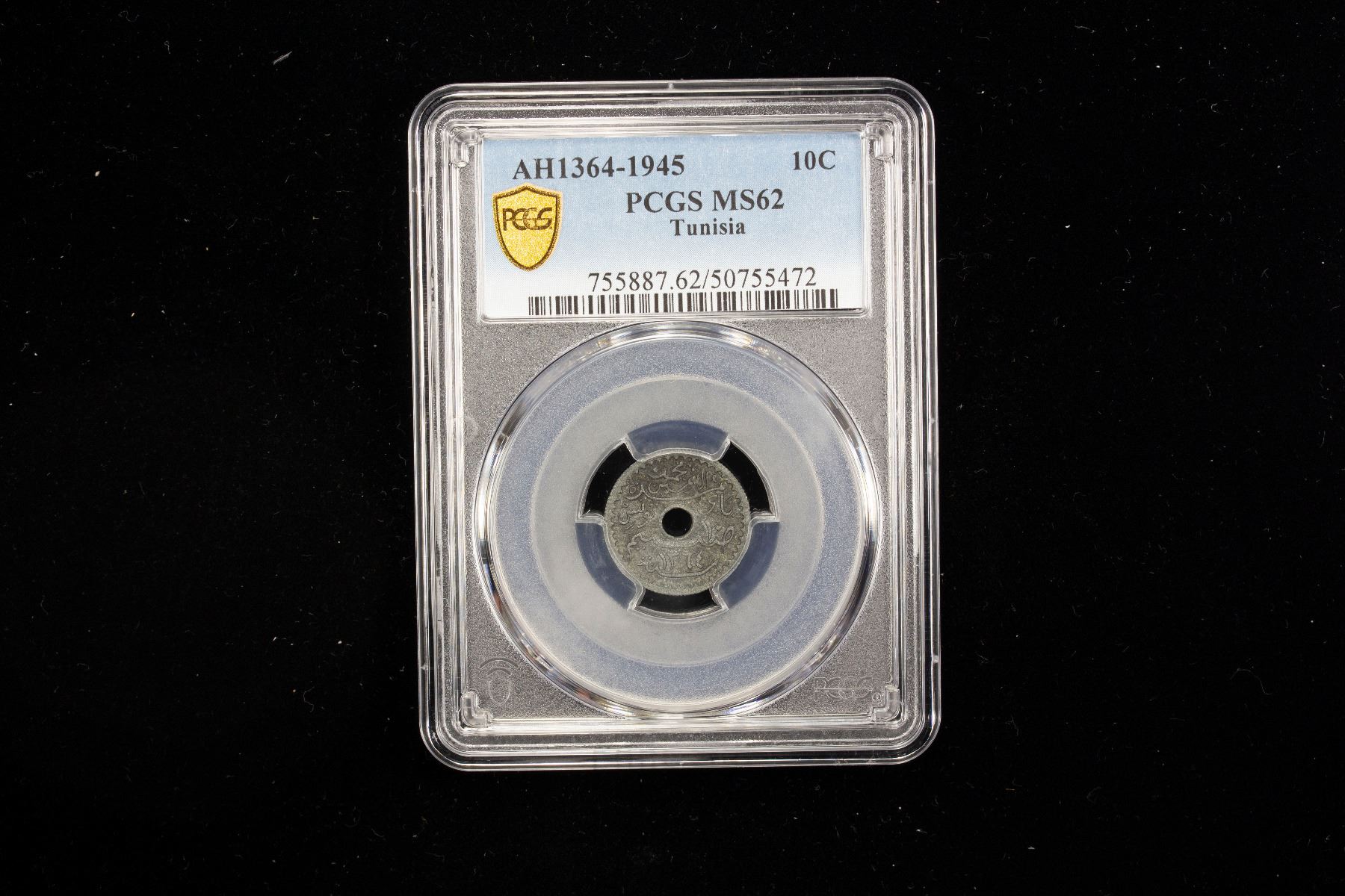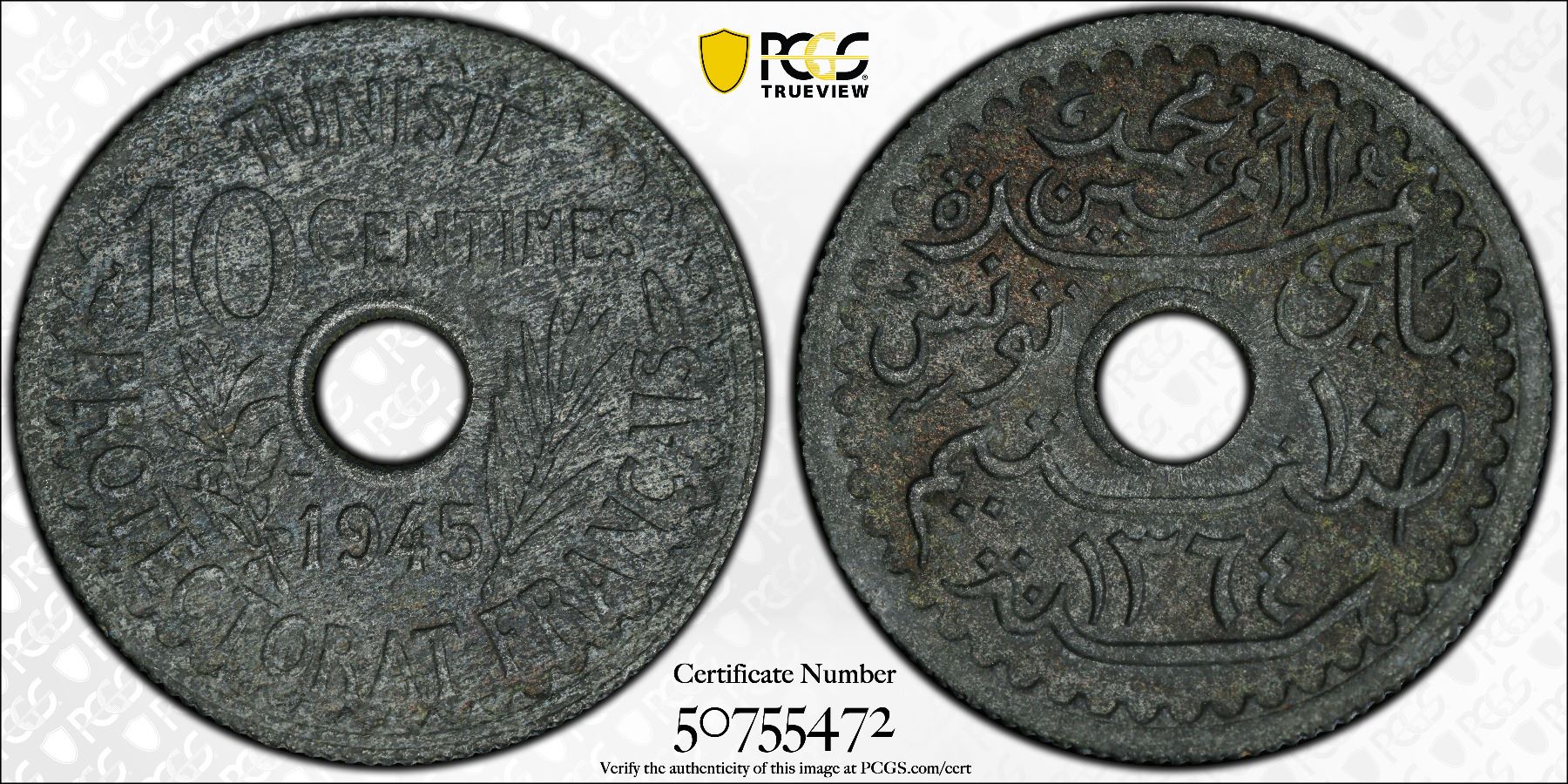 TUNISIA: French Protectorate, 10 centimes, 1945/AH1364, KM-271, a lovely well struck mint state example! PCGS graded MS62, ex Dr. Wolfgang Schuster Collection.