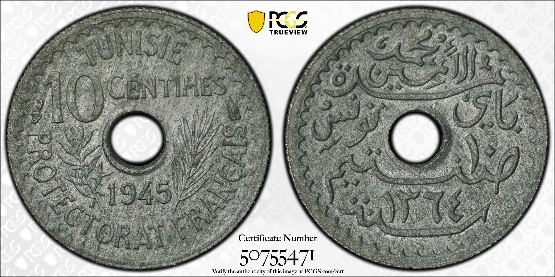 TUNISIA: French Protectorate, 10 centimes, 1945/AH1364, KM-271, a lovely well struck mint state example! PCGS graded MS63, ex Dr. Wolfgang Schuster Collection.