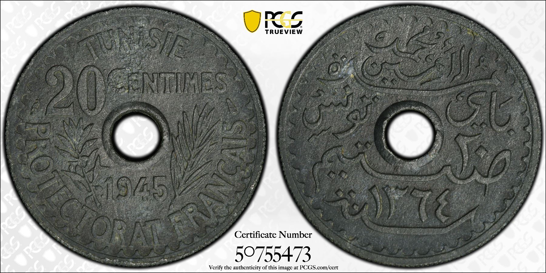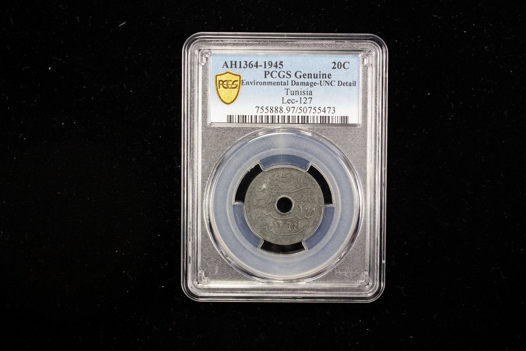 TUNISIA: French Protectorate, 20 centimes, 1945/AH1364, KM-272, Lec-127, a well struck example, environmental damage, PCGS graded UNC details, ex Dr. Wolfgang Schuster Collection.