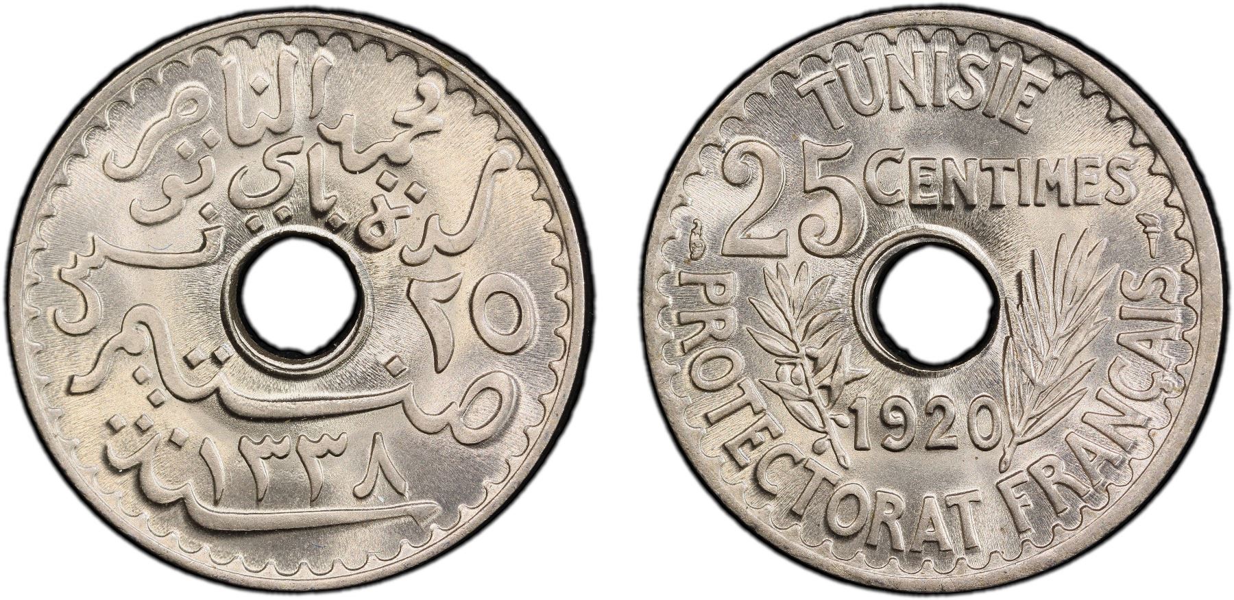 TUNISIA: Muhammad V, 1906-1922, 25 centimes, 1920/AH1338, PCGS MS67