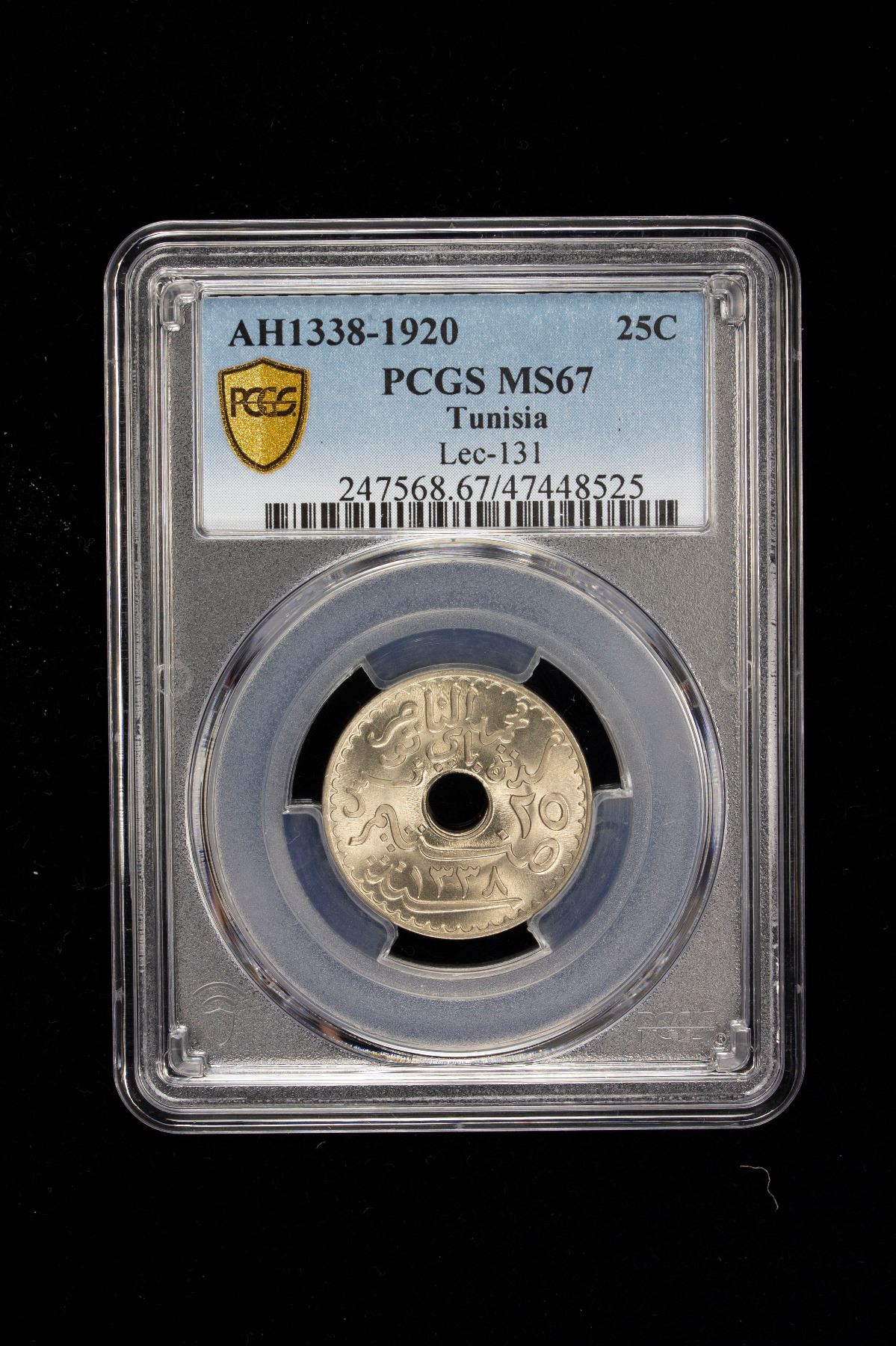 TUNISIA: Muhammad V, 1906-1922, 25 centimes, 1920/AH1338, KM-244, Lec-131, a superbly lustrous example with prooflike fields, top pop at PCGS (1/0), PCGS graded MS67, ex Charles W. Lueders III Collection.