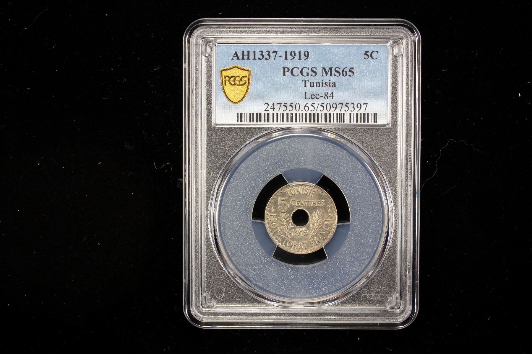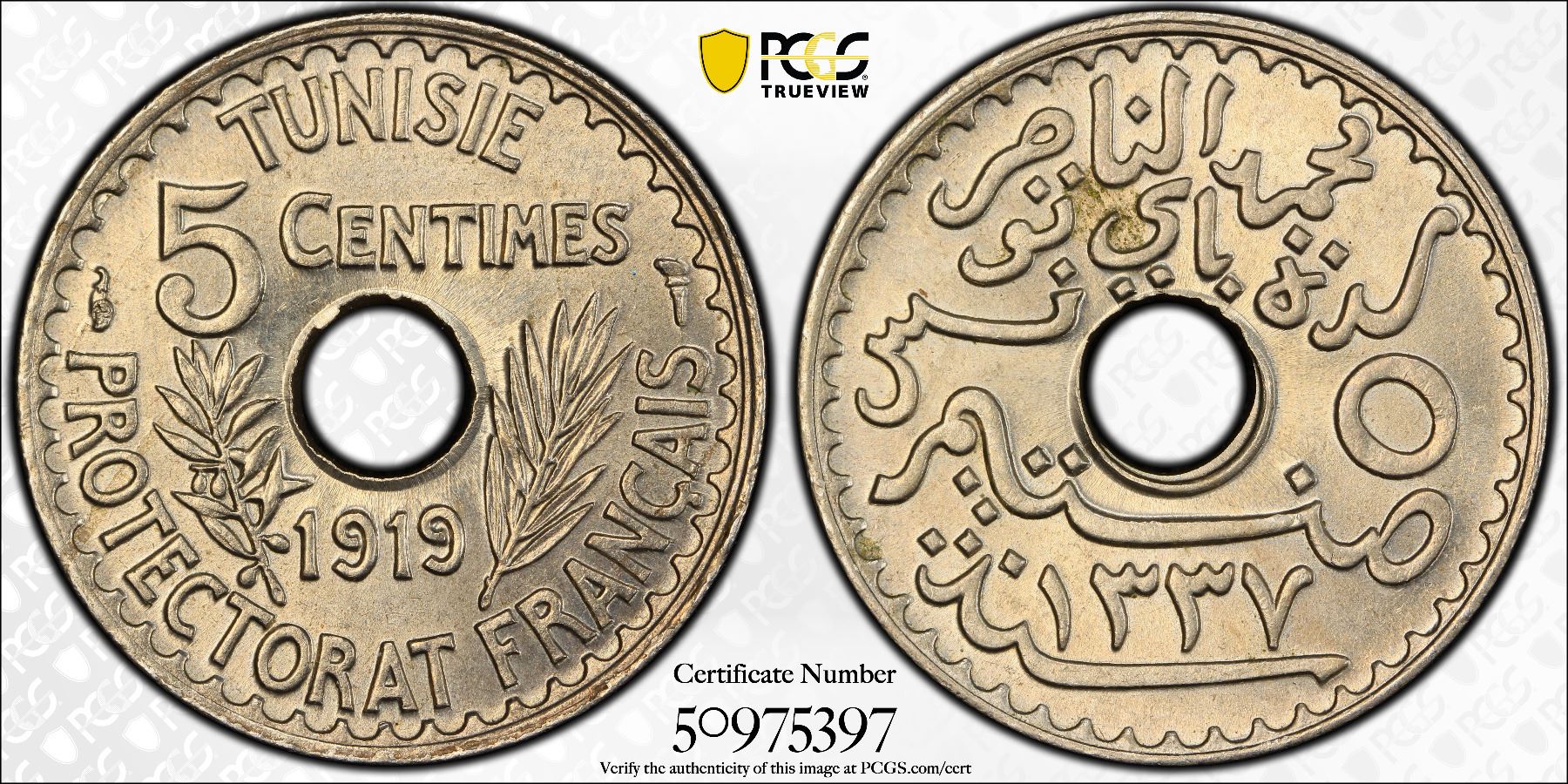 TUNISIA: Muhammad V, 1906-1922, 5 centimes, 1919/AH1337, PCGS MS65