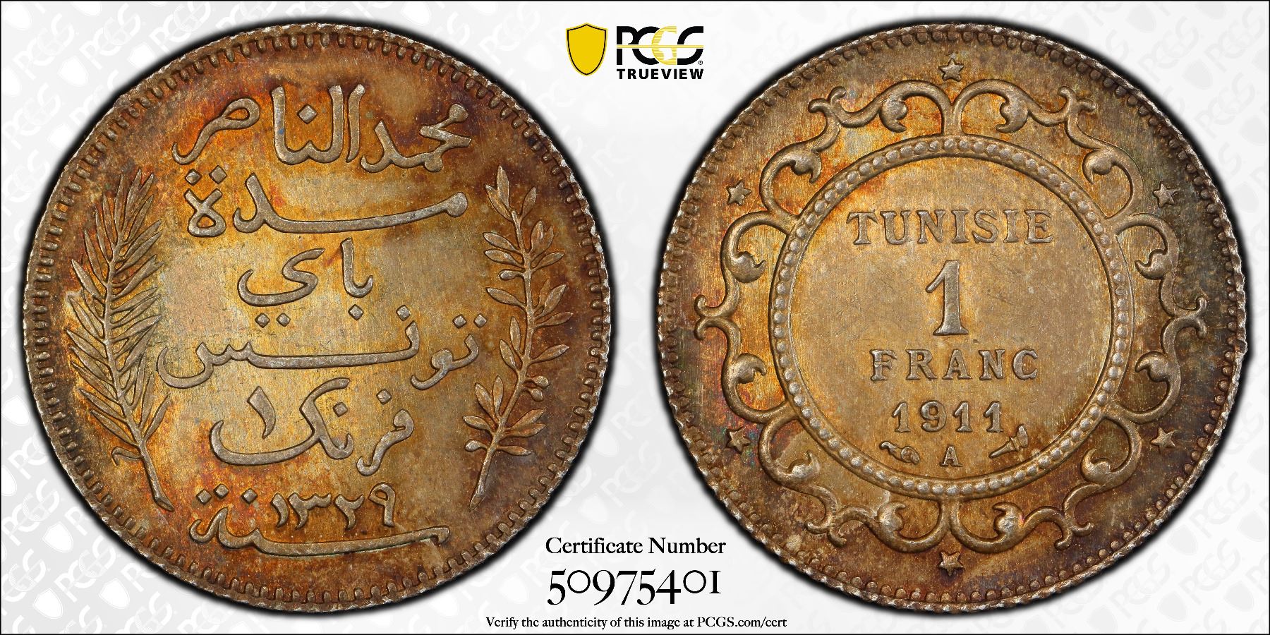 TUNISIA: Muhammad V, 1906-1922, AR franc, 1911/AH1329, PCGS MS65