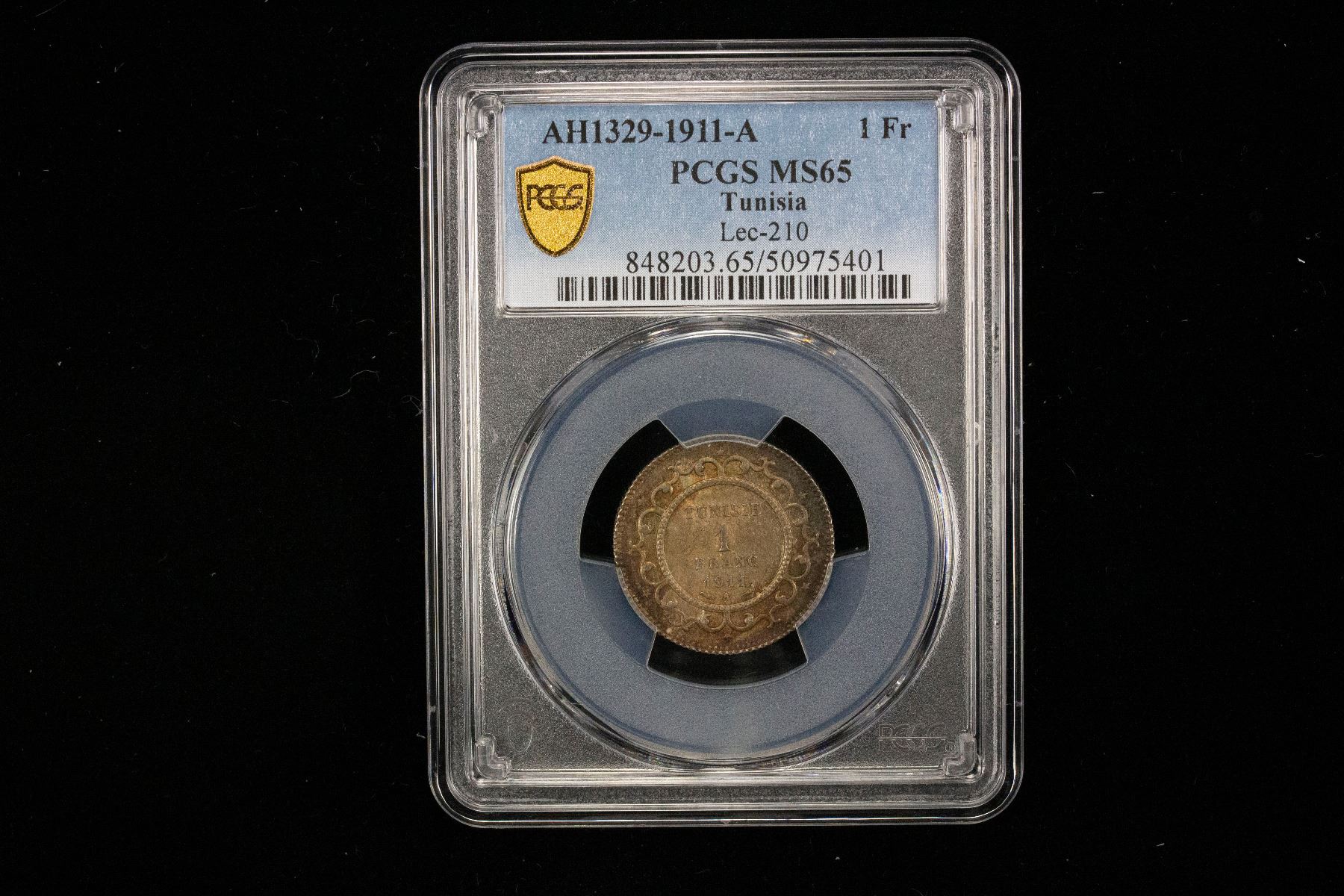 TUNISIA: Muhammad V, 1906-1922, AR franc, 1911/AH1329, KM-238, Lec-210, a superb toned mint state example! PCGS graded MS65.