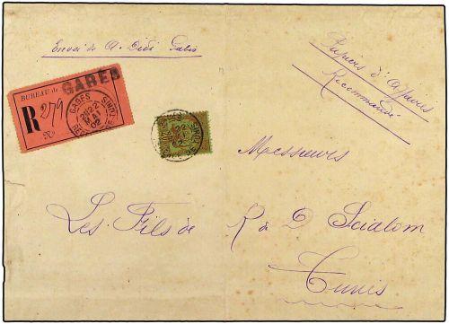 1904 (Jan 30) Registered Printed Matter rate cover to Tunis at 15c rate (5c postage + reduced registration tariff of 10c) franked by single 1901 15c grey tied by SOUSSE cds with pink registration label (only used in connection with reduced price registration) tied at left. The cover is endorsed ´Papiers D´Affaires Recommandée envoyé Abdallah Hedda´ . Rare, apparently unique usage. Scott 16.