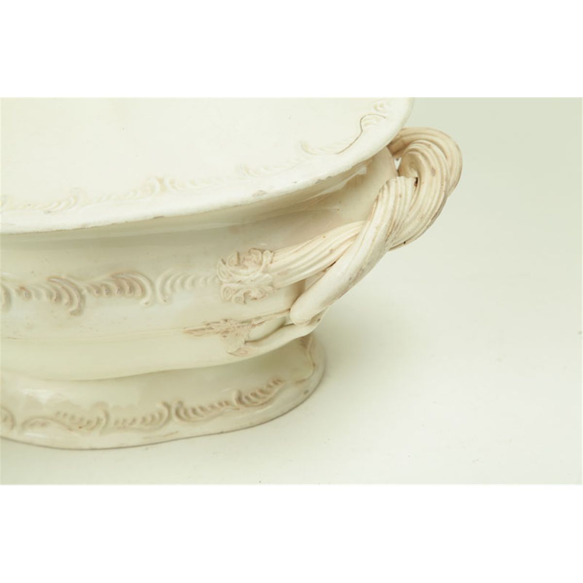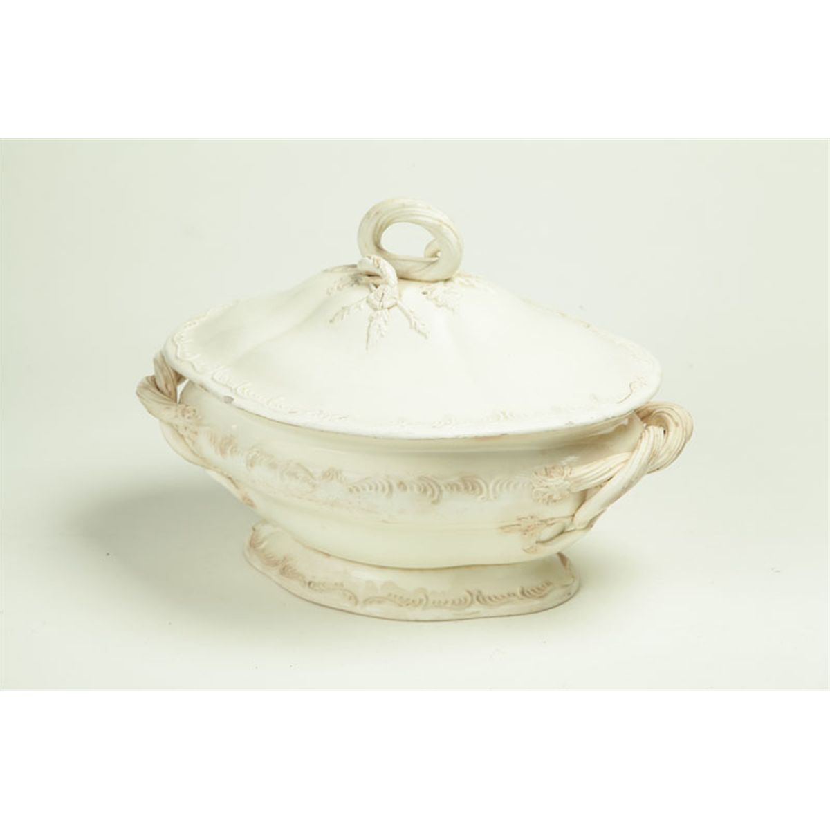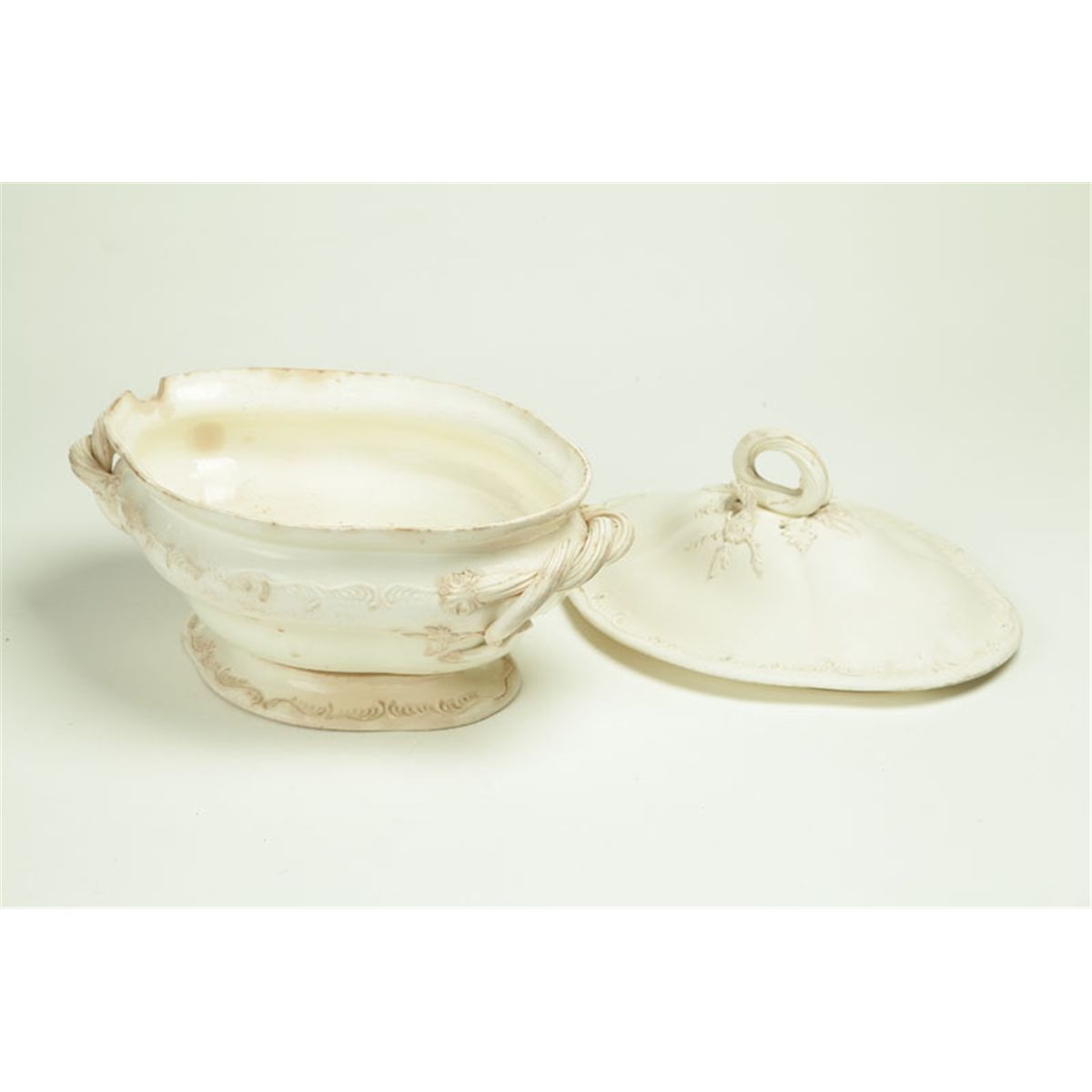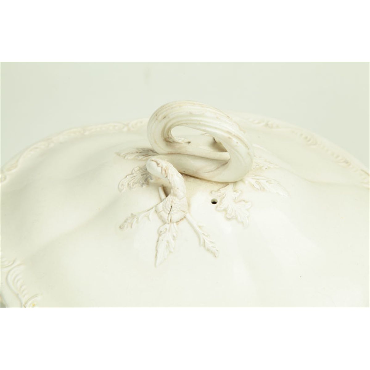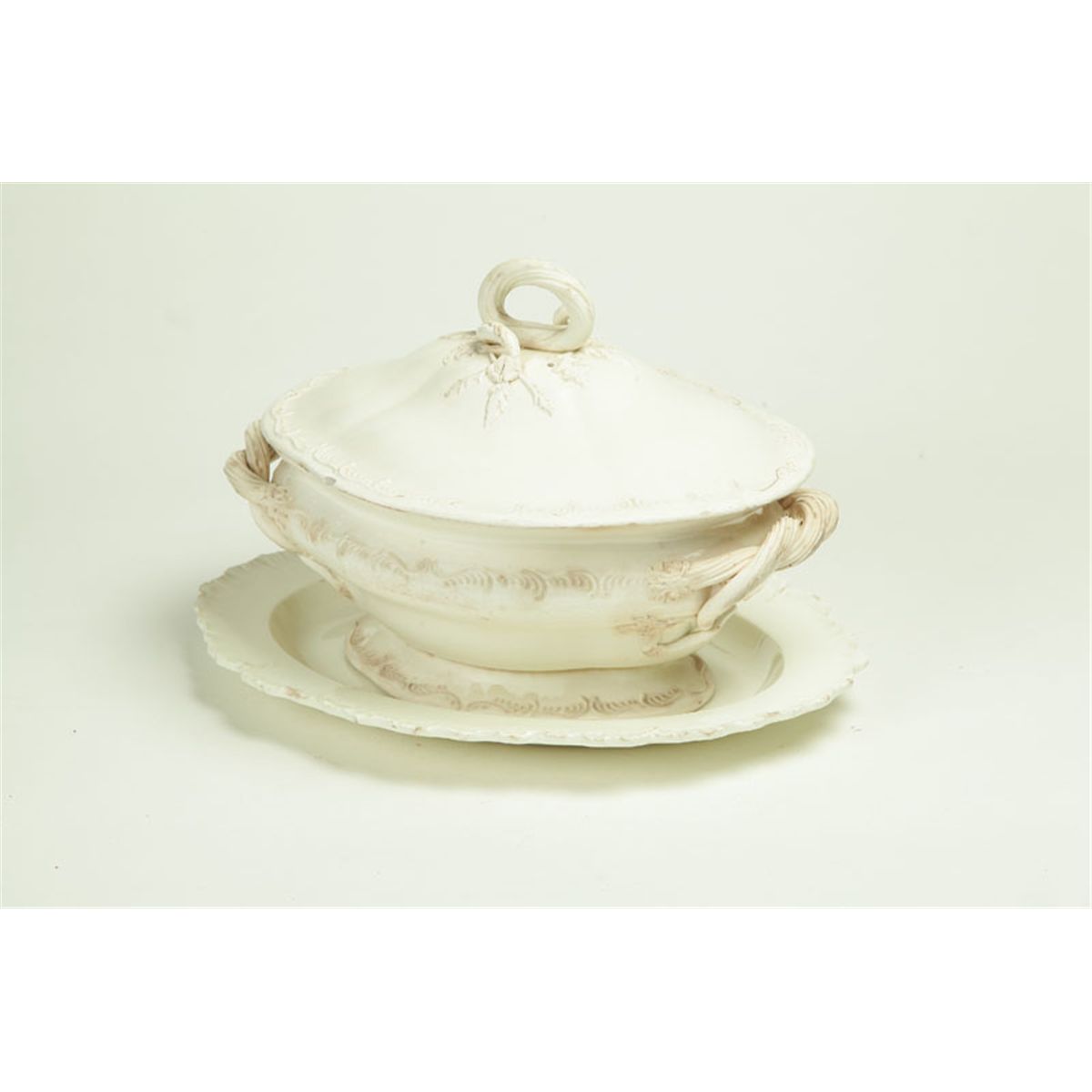 England, late 18th-early 19th century, creamware. Tureen with molded designs, mostly leaves, and naturalistic handles, 13"l. Ex Elmer Webster (Ohio). And an oval Queensware platter with feathered edge marked "Wedgwood", 14 1/4"l. Minor imperfections.