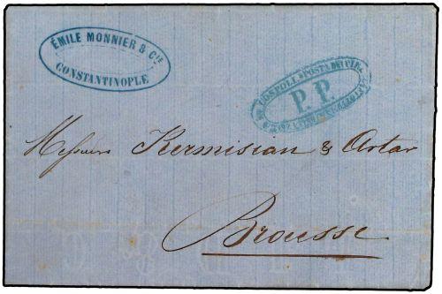 1860(Aug 10) Entire letter from Constantinople to Brousse with Company cachet in blue at upper left and fine strike of scarce oval Turkish Steamship Company ´Gospoli *Posta Del Piroscafi Ottomani Della Zecca-PP´ superbly struck in blue. Rare so fine.