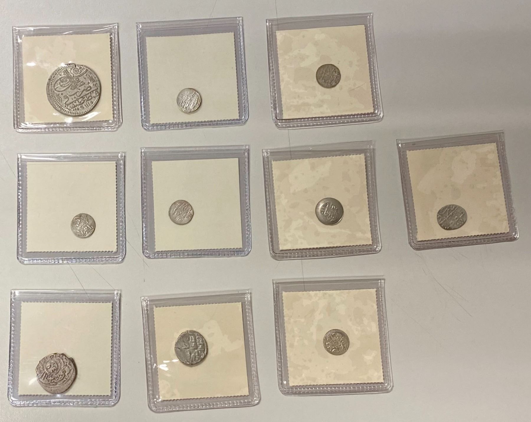 TURKEY: LOT of 10 small denomination silvers, akçe: KM-371: AH1187 year 1 (2pcs, the first AU with die clashes both sides, the second Choice AU with obverse die clash), year 2 (2pcs, Choice VF, Unc), year 4 (2 pcs, Unc, Choice AU with obverse die clash); KM-550: AH1223 year 1 (AU with obverse die clash); onluk: KM-42.1: AH 1027 (date off flan, F-VF); KM-54: AH1032 (VF-XF); and KM-147: AH1115 (AU, edge defect); retail value $950, lot of 10 items, ex Hans Wilski Collection.