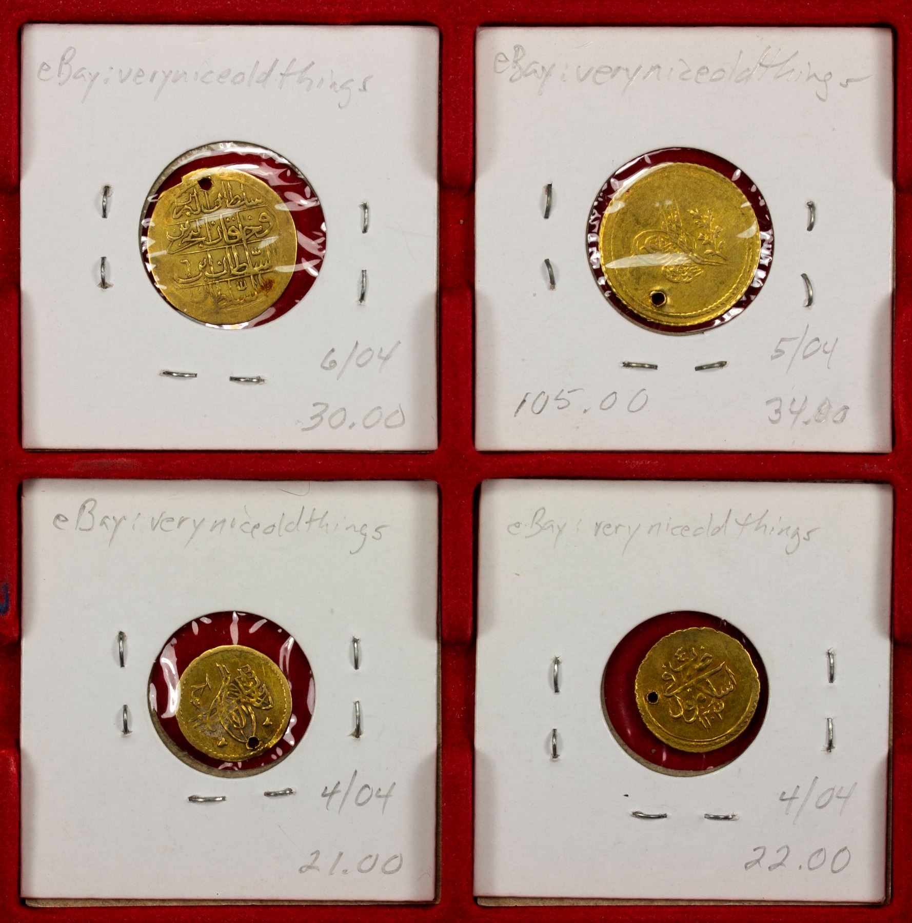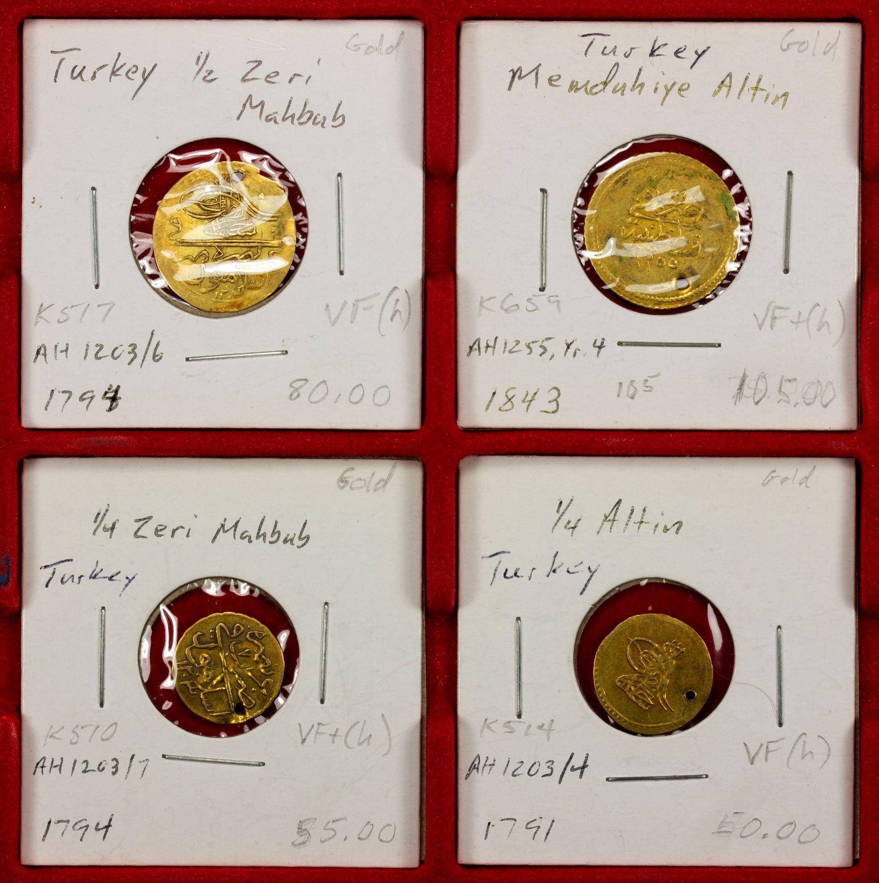 TURKEY: LOT of 4 AV coins, including AH1203 1/4 Altin, AH 1255 Altin, and AH 1203 1/2 & 1/4 zeri mahbub, all holed, VF-EF; retail value $350, lot of 4 pieces.