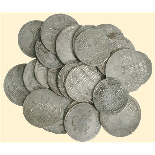 Lot of 25 coins. Piastres and other large silver coins, interesting dates and types.