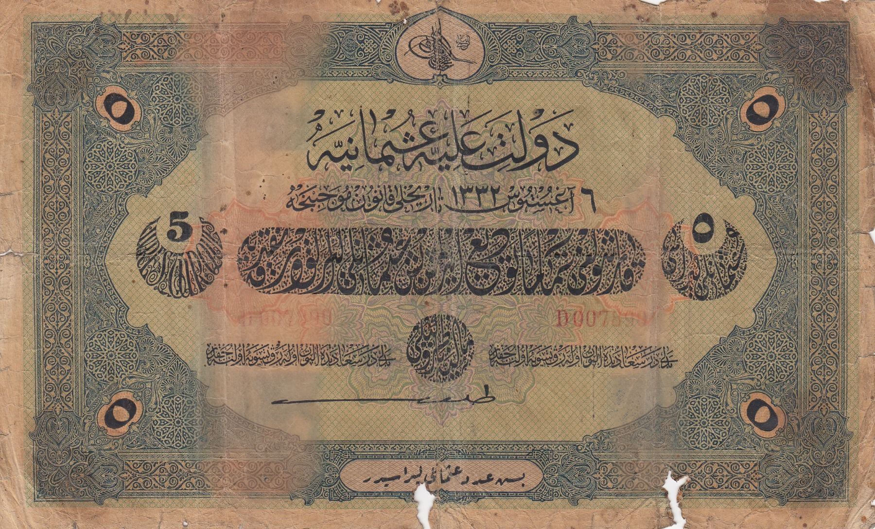 Turkey, Ottoman Empire, 5 Lira, 1916, POOR, p91, Talat / Janko