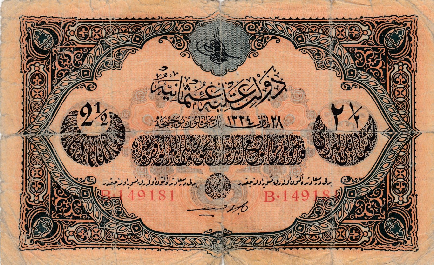 Turkey, Ottoman Empire, 2 1/2 Lira, 1918, VF p108b, Cavid / Hüseyin Cahid