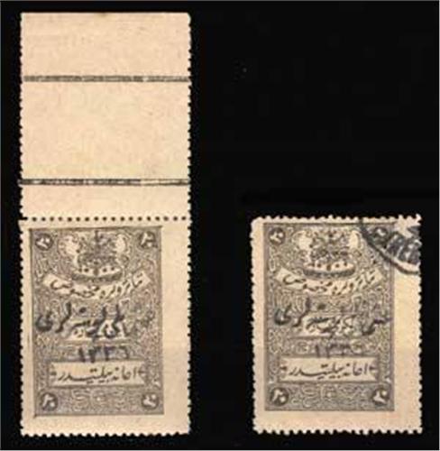Anatolian Government 1920 20pa black h/s on Theatre Tax stamp (Mi 716) top marginal with light bend and small rust spot in margin u/m, and used example with part octagonal Trebizonda cancellation, small rust spot, rare pair one of the gems of Turkish Phi