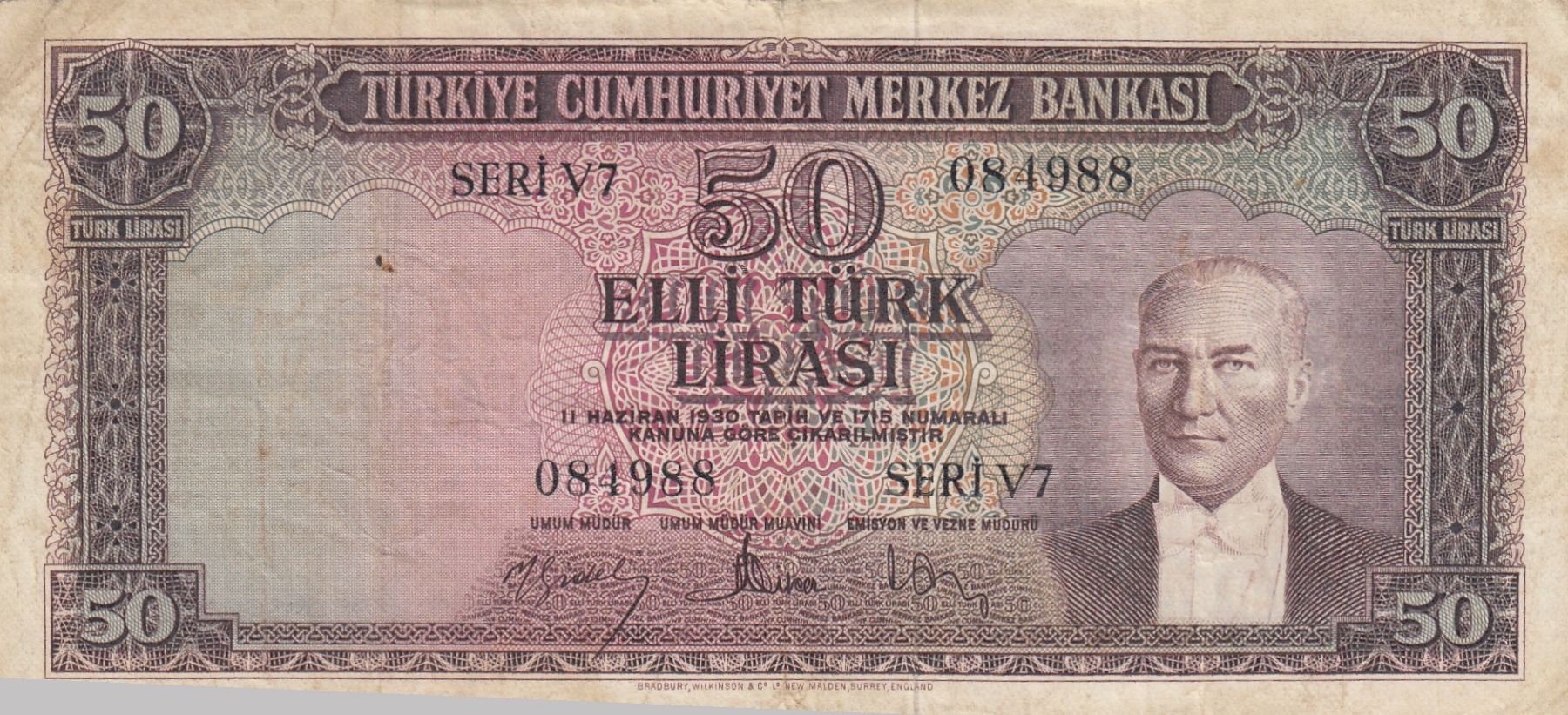 Turkey, 50 Lira, 1957, FINE, p165, 5/4. Emission