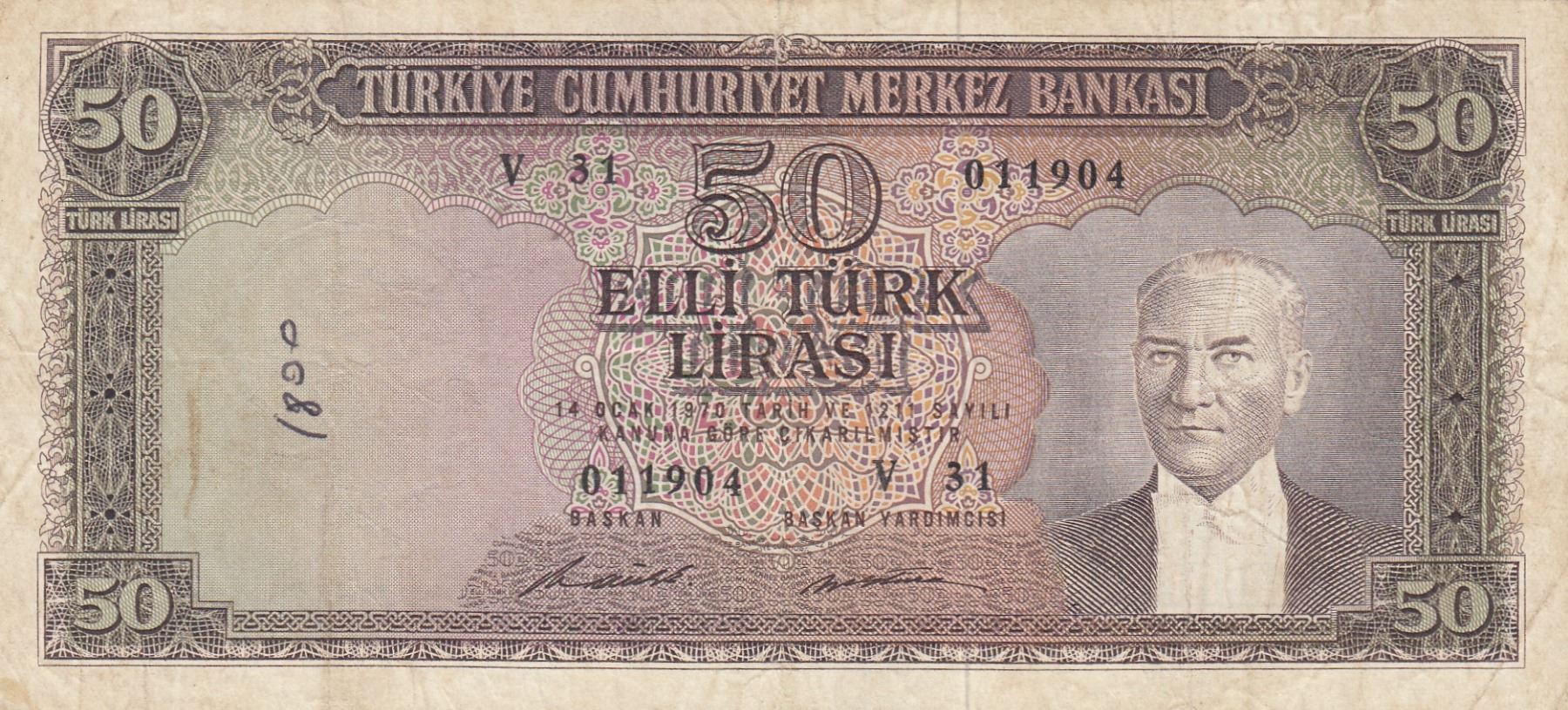 Turkey, 50 Lira, 1971, VF, P187a, 5/7. Emission