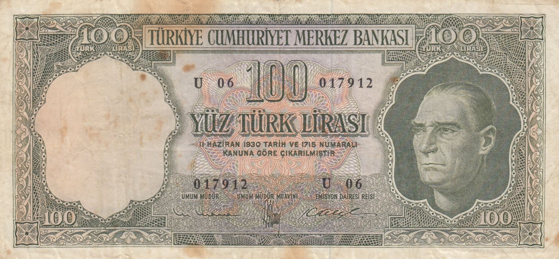 Turkey, 100 Lira, 1962, POOR, p176, 5/4. Emission