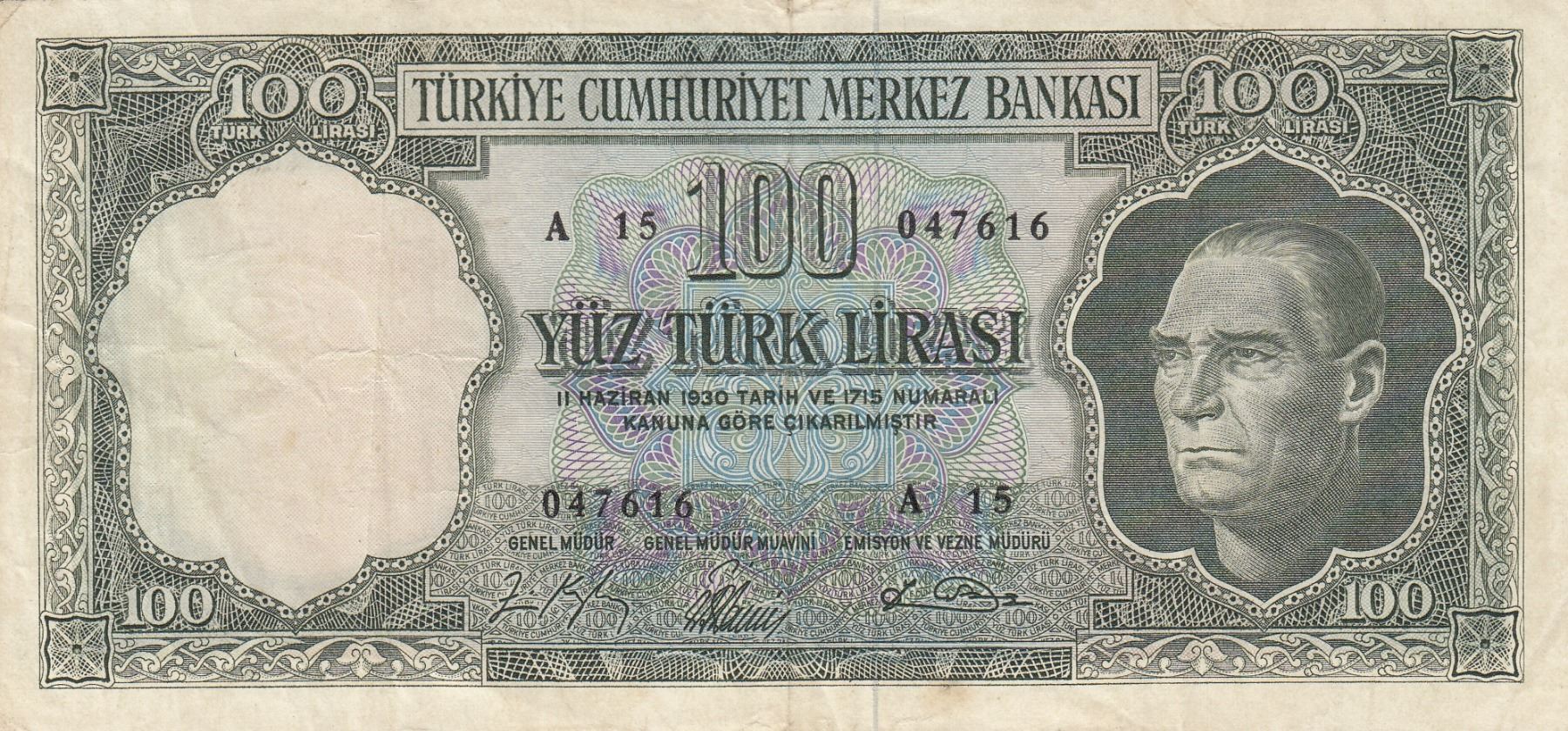 Turkey, 100 Lira, 1964, VF, p177, 5/5. Emission