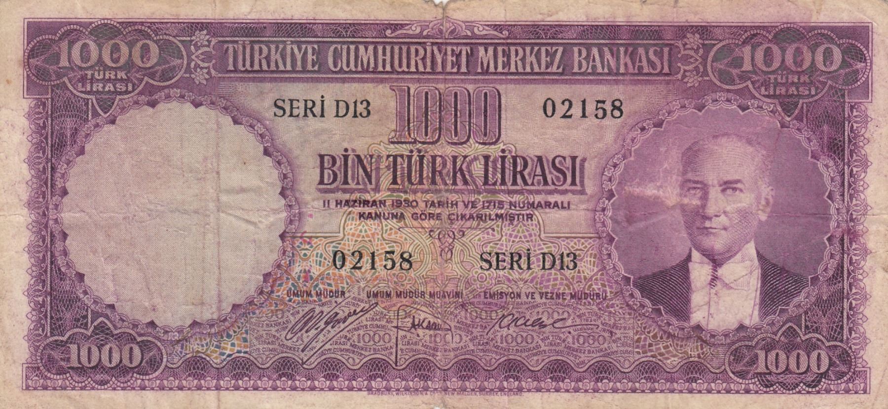 Turkey, 1000 Lira, 1953, POOR, p172, 5/1. Emission