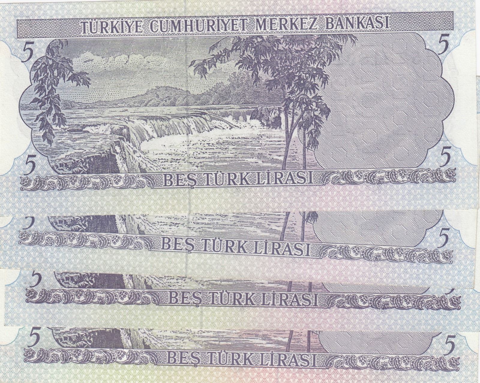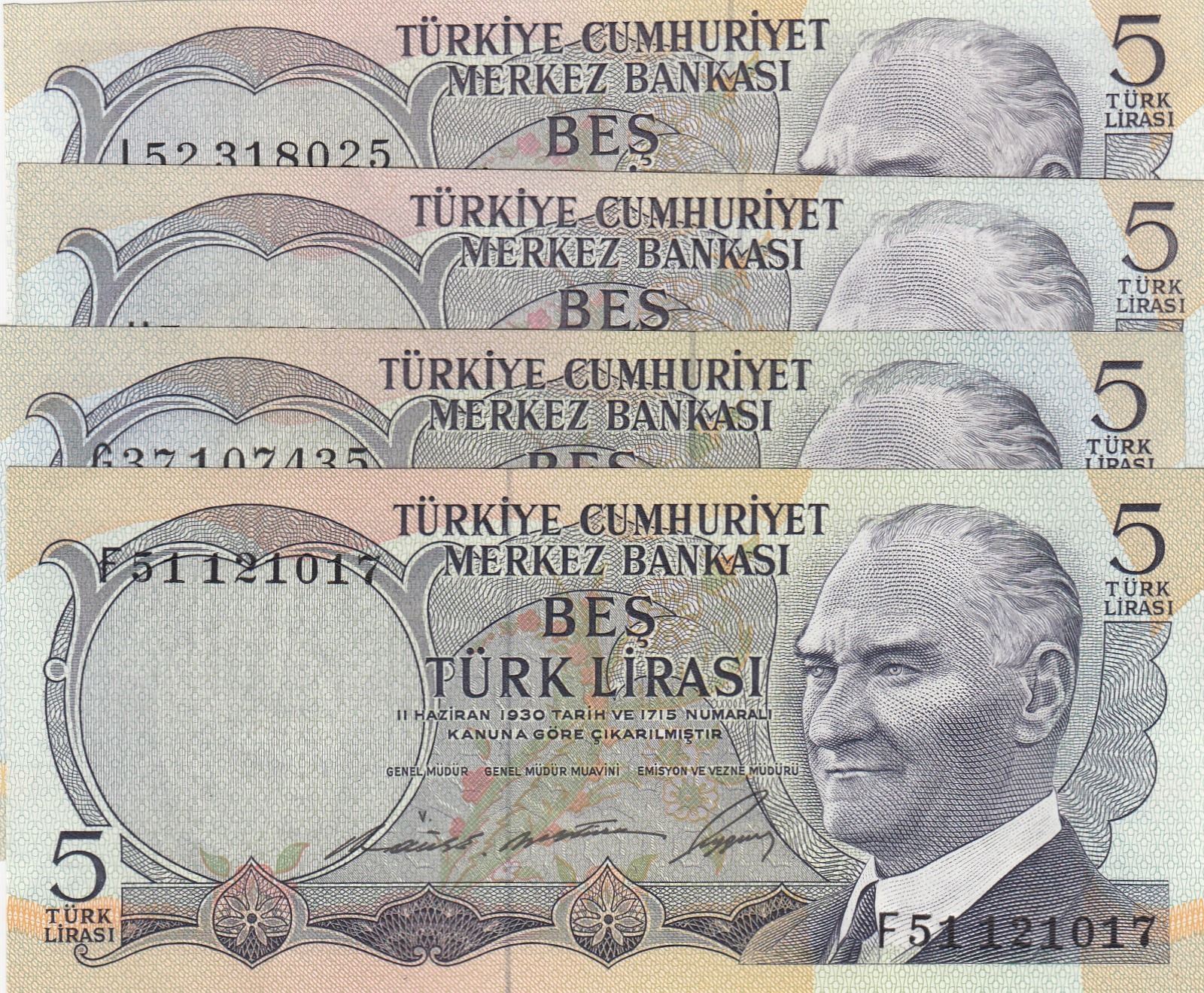 Turkey, 5 Lira, 1968 / 1976, UNC, p179 / p185, 6/1. ve 6/2. Emission, (Total 4 banknotes)