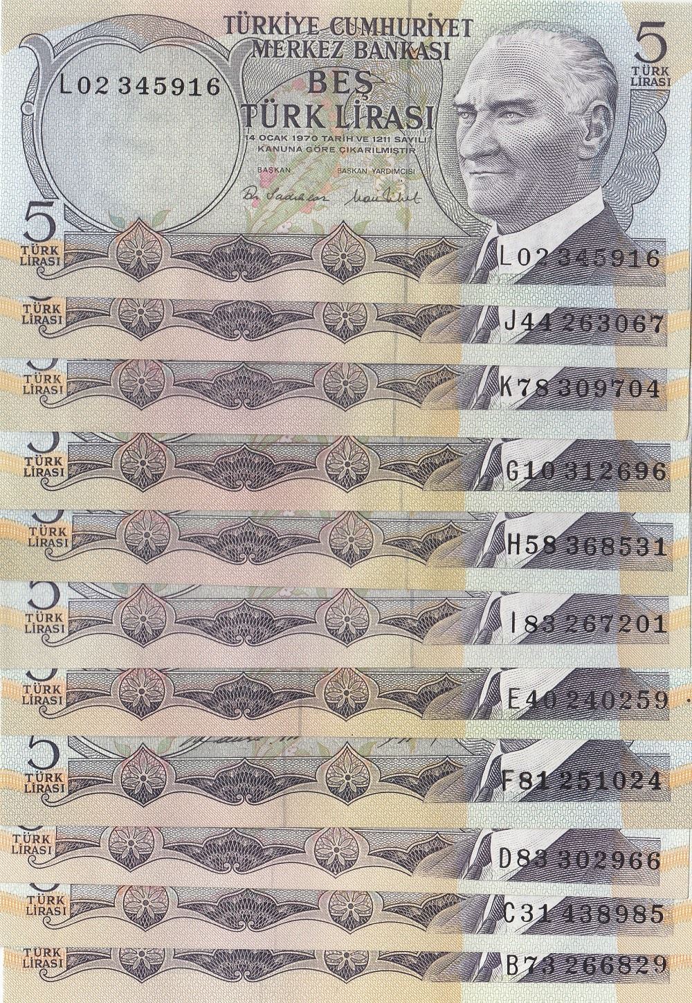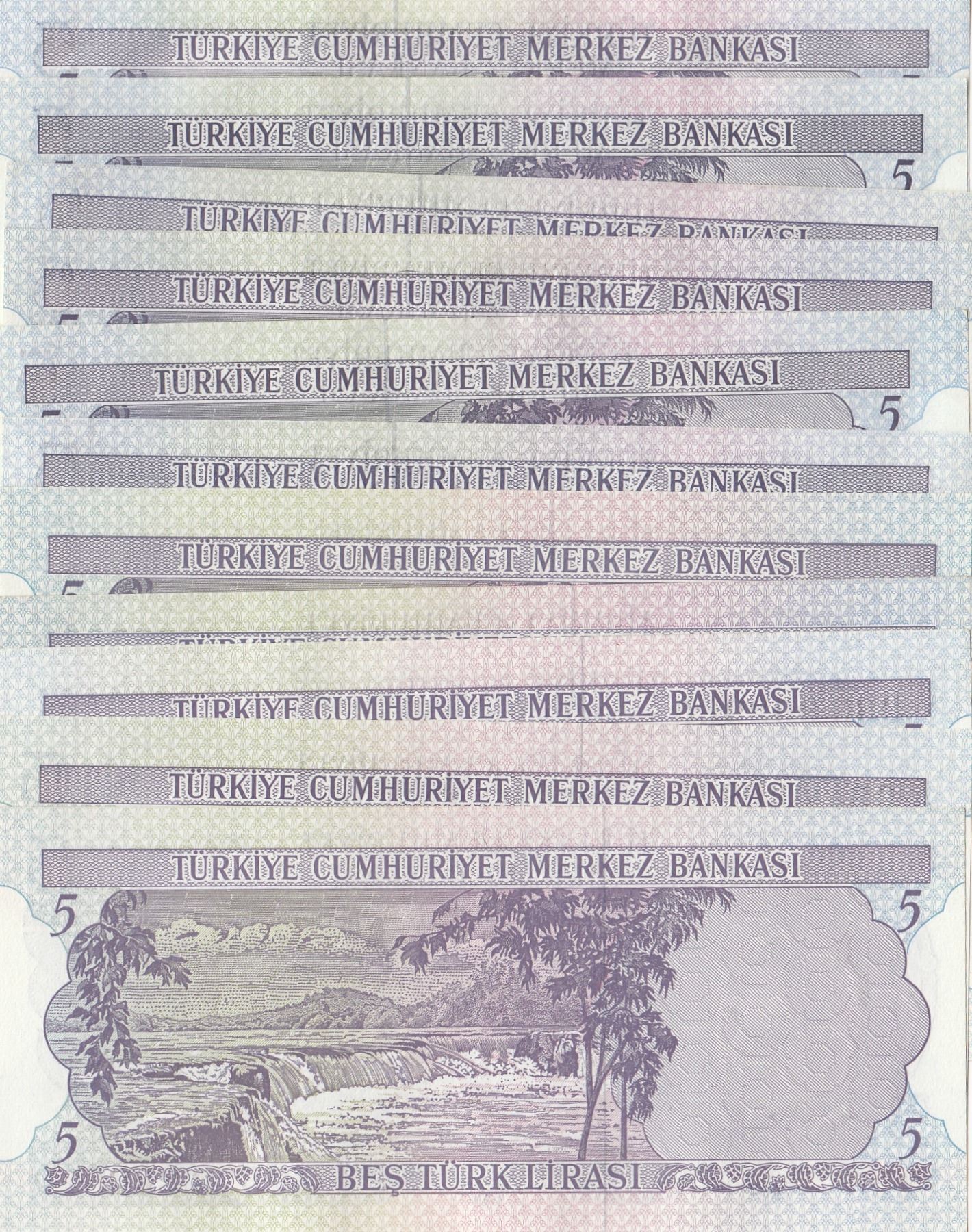 Turkey, 5 Lira, 1968/1976, UNC, p179 /p185, 6. Emission full prefix set, (Total 12 banknotes)