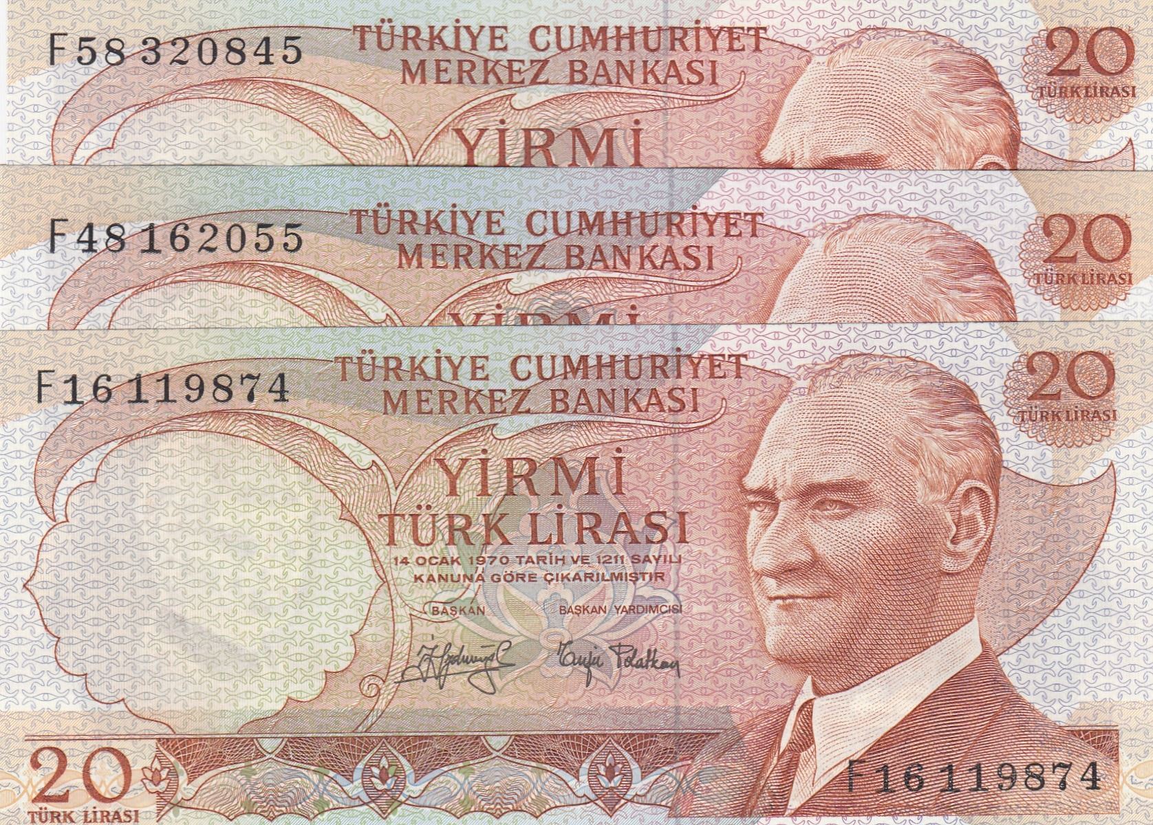 Turkey, 20 Lira, 1979, UNC, p187, 6/3. Emission, (Total 3 banknotes)