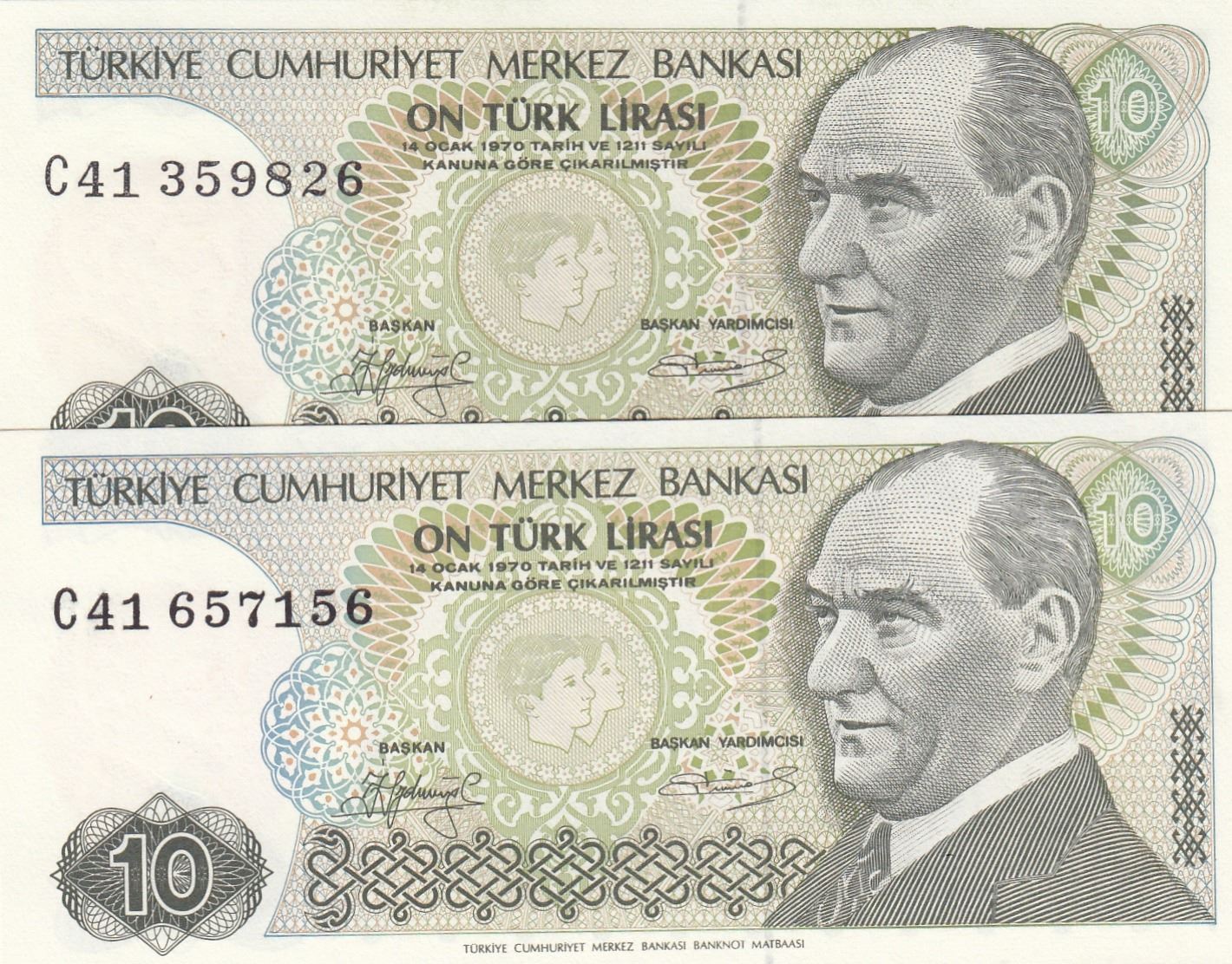 Turkey, 10 Lira, 1979, UNC, p192, 7/1. Emission, "LONG AND SHORT EYEBROW SET", (Total 2 banknotes)