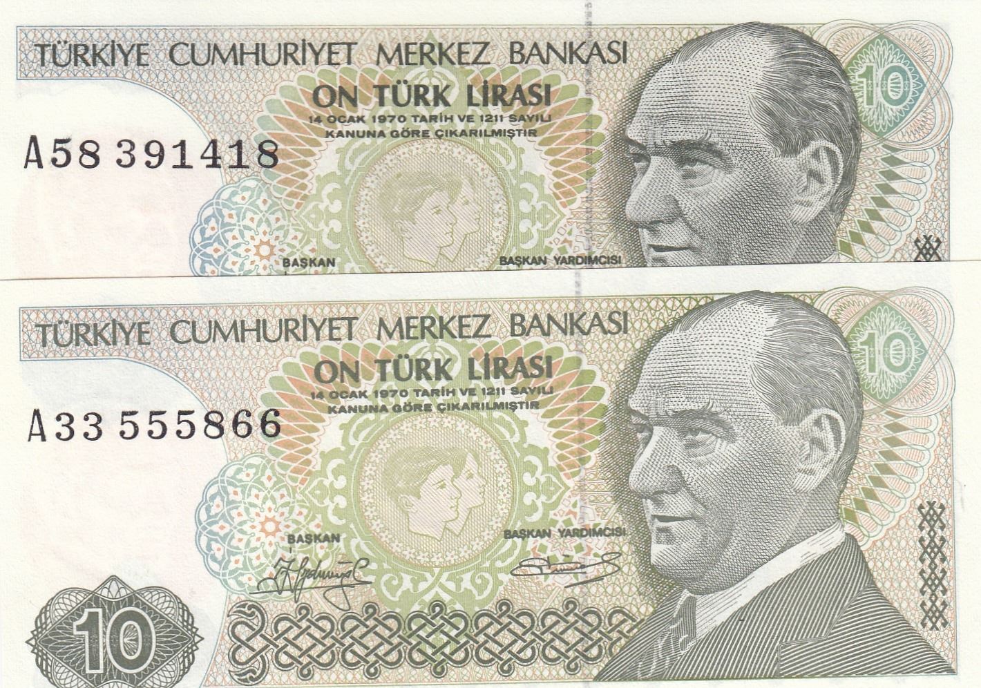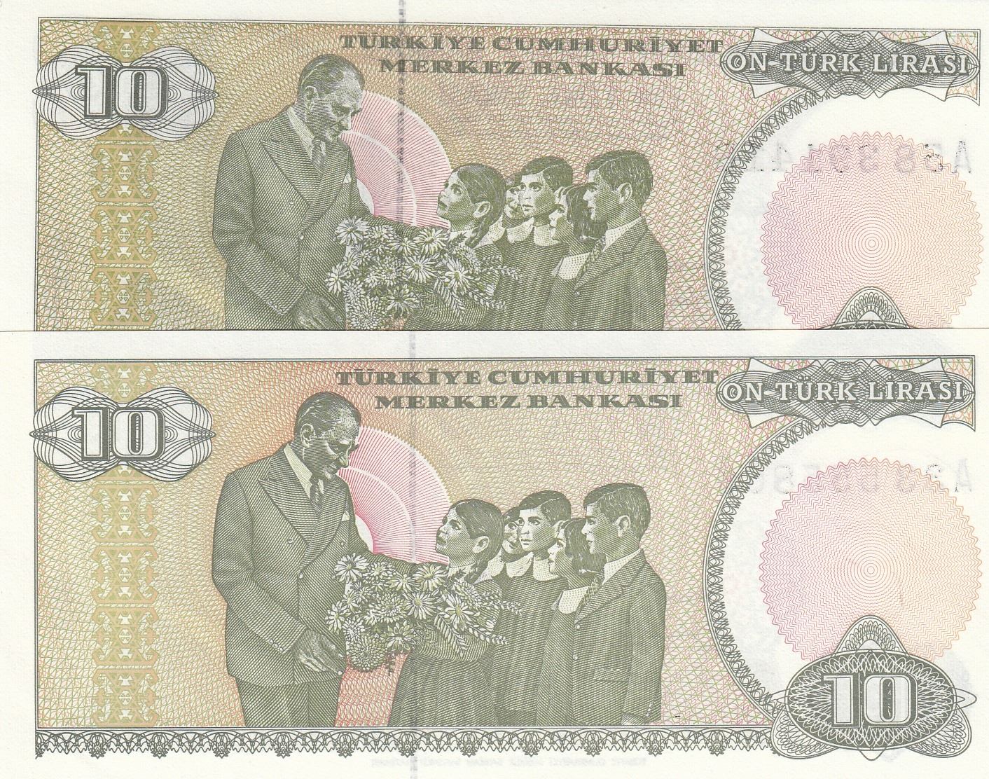 Turkey, 10 Lira, 1979, UNC, p192, 7/1. Emission, "LONG AND SHORT EYEBROW SET", (Total 2 banknotes)