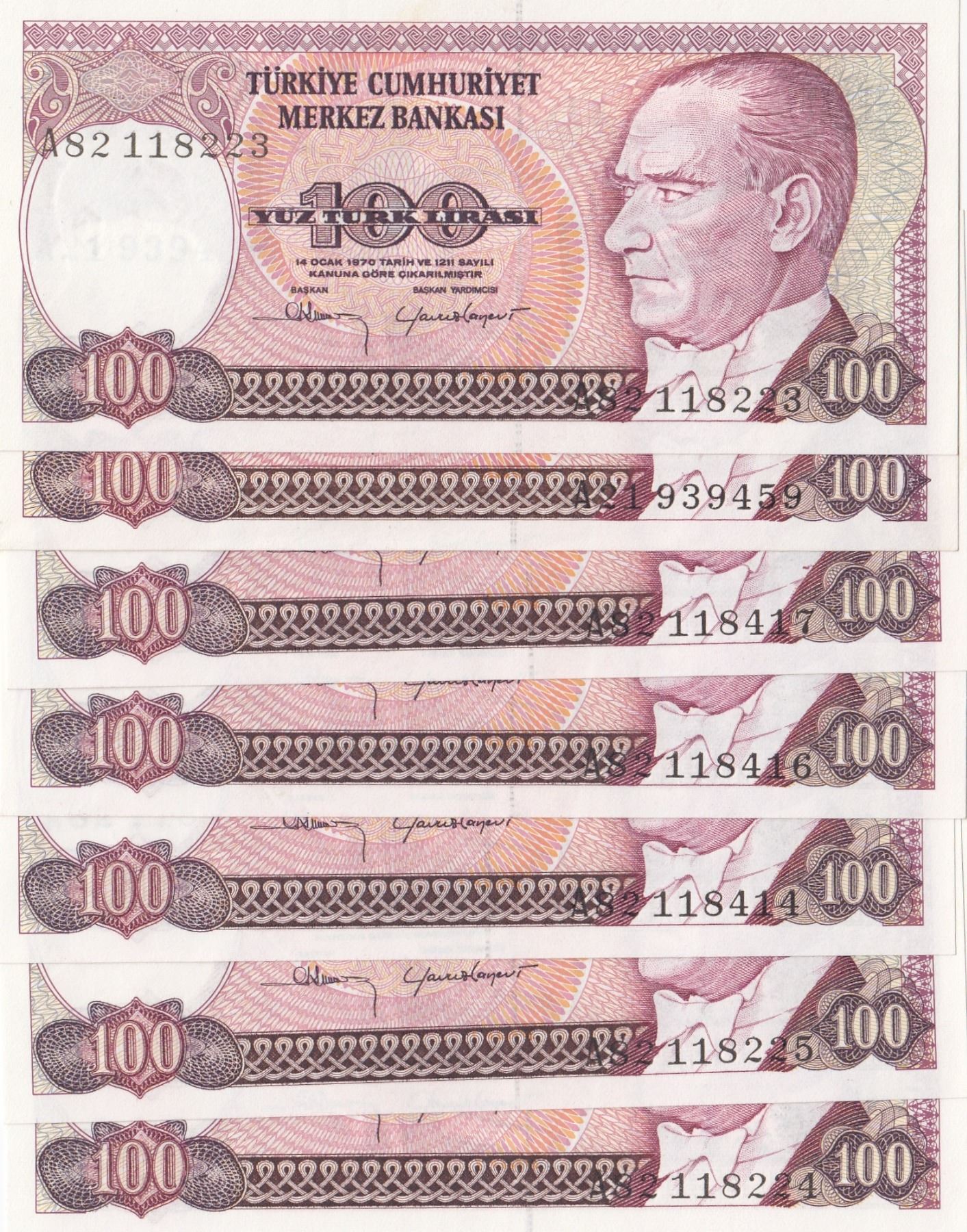 Turkey, 100 Lira, 1983, AUNC (+) / UNC, p194, 7/1. Emission, (Total 7 banknotes)
