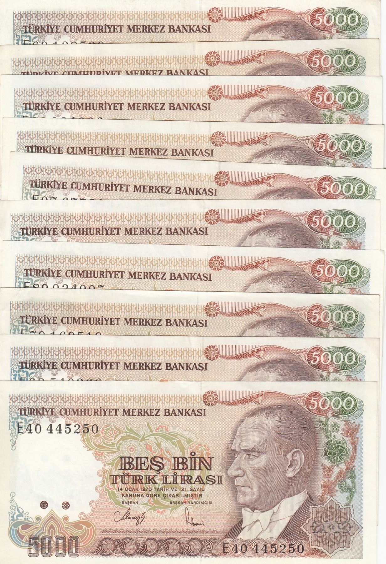 Turkey, 5.000 Lira, 1988, XF / UNC, p197, 7/3. Emission, (Total 10 banknotes)