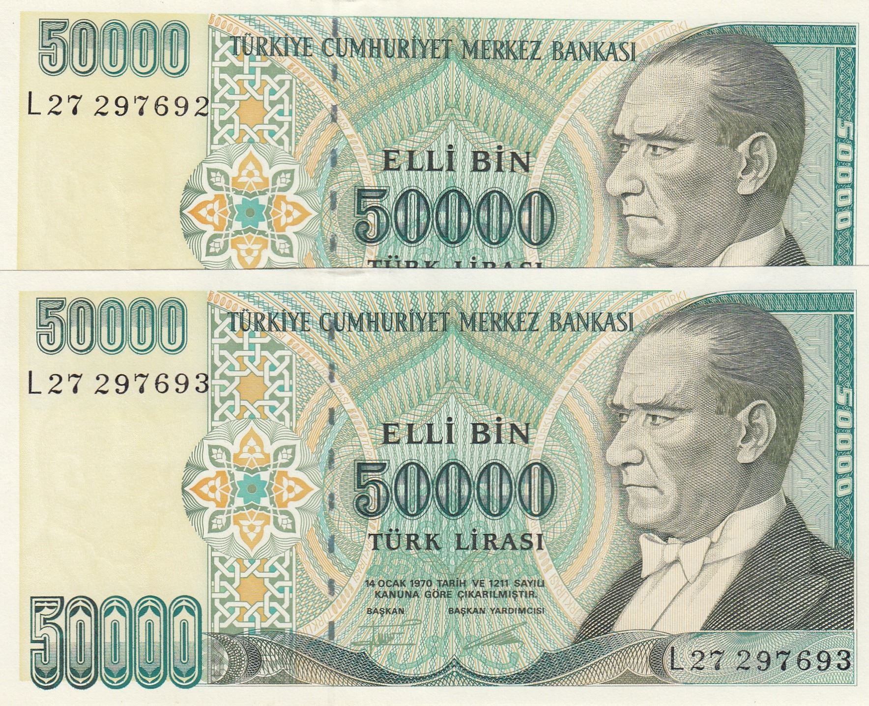 Turkey, 50.000 Lira, 1995, UNC, p204, (Total 2 consecutive banknotes)