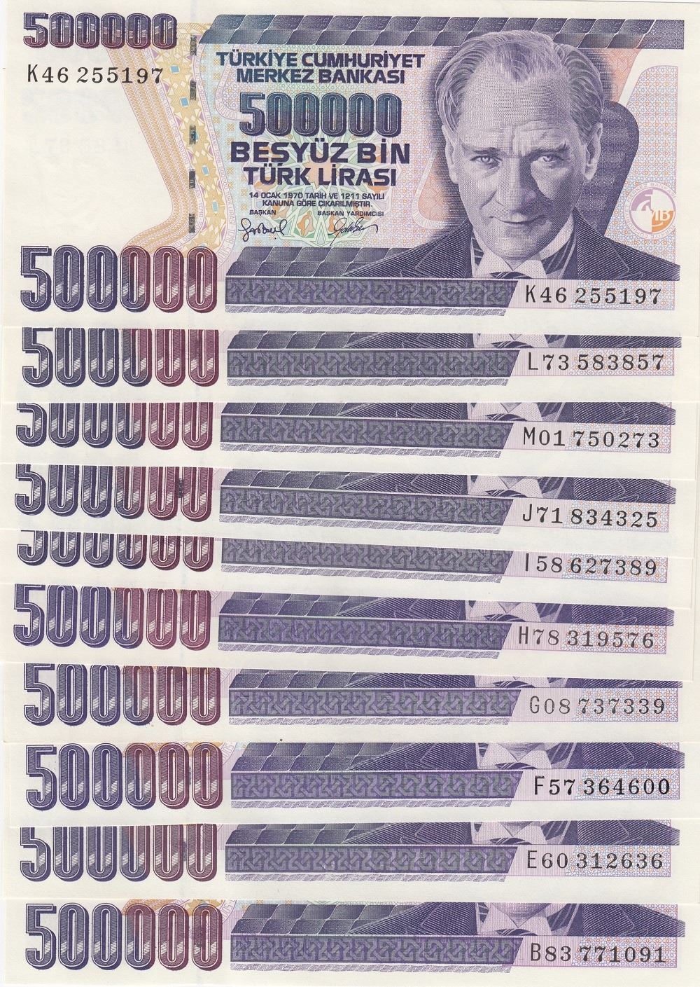Turkey, 500.000 Lira, 1993/1997, UNC, p208a/ p208c/ p212, 7. Emission, (Total 10 banknotes)