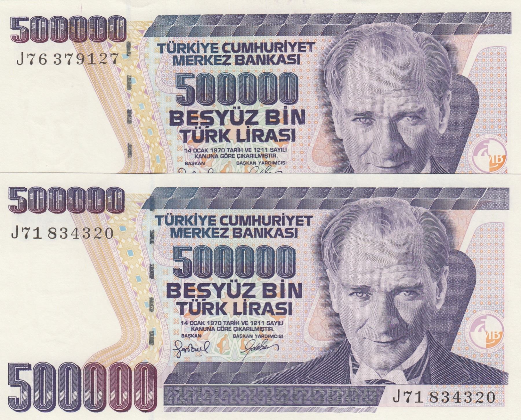 Turkey, 500.000 Lira, 1997, UNC, p212, 7/4. Emission, DIFFERENT WATERMARK, (Total 2 banknotes)