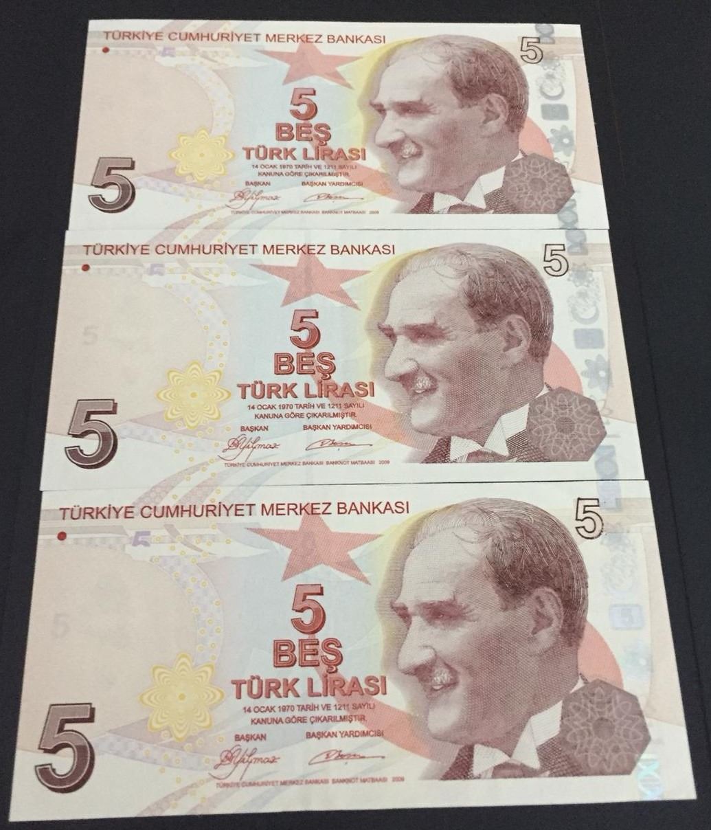 Turkey, 5 Lira, 2009, XF / UNC, p222a, 9/1. Emission, (Total 3 banknotes)