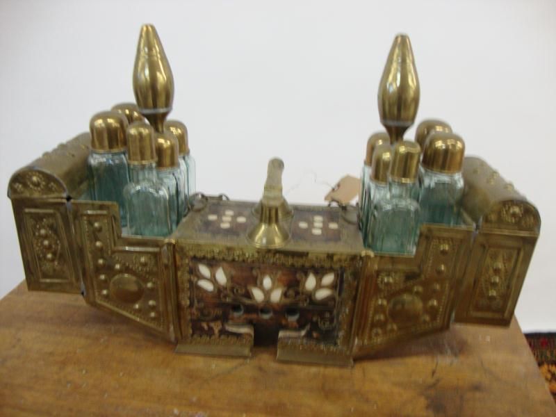 -with walnut and mother-of-pearl inlaid accents. Collection of ten brass topped blown glass bottles for cleaning products and polished as well as rose water and other perfuming agents. Complete with compartments and drawers for polishing supplies and money that has been collected.
