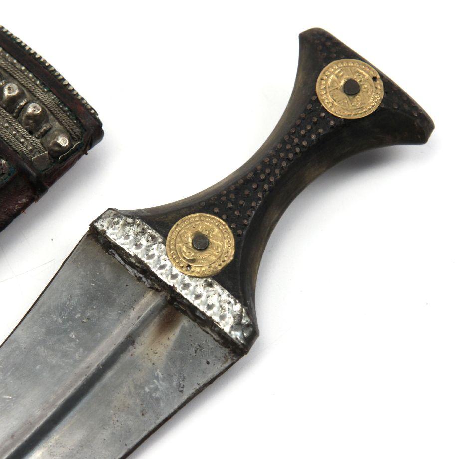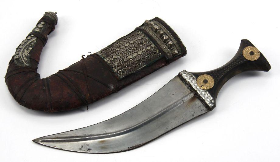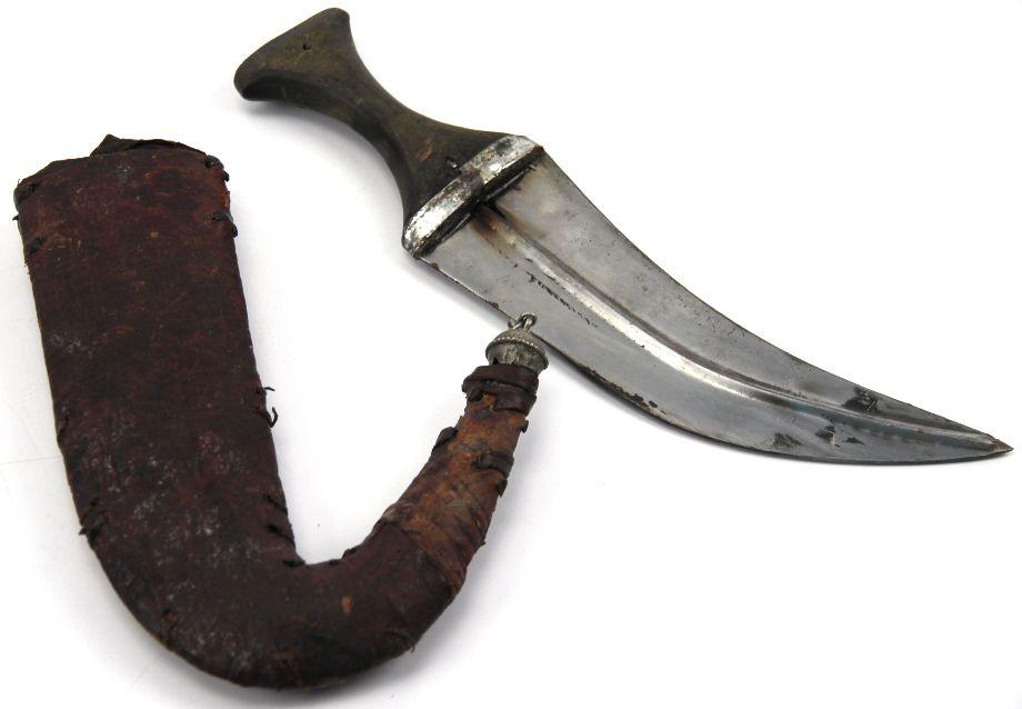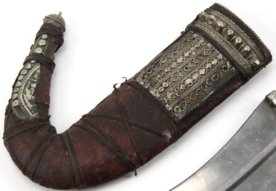 A Turkish knife with 8 inch upward curved blade. Leather over wood scabbard, with rough telkari patterns. Crudely fashioned blade of layered steel. No markings, age and time of manufacture unknown.