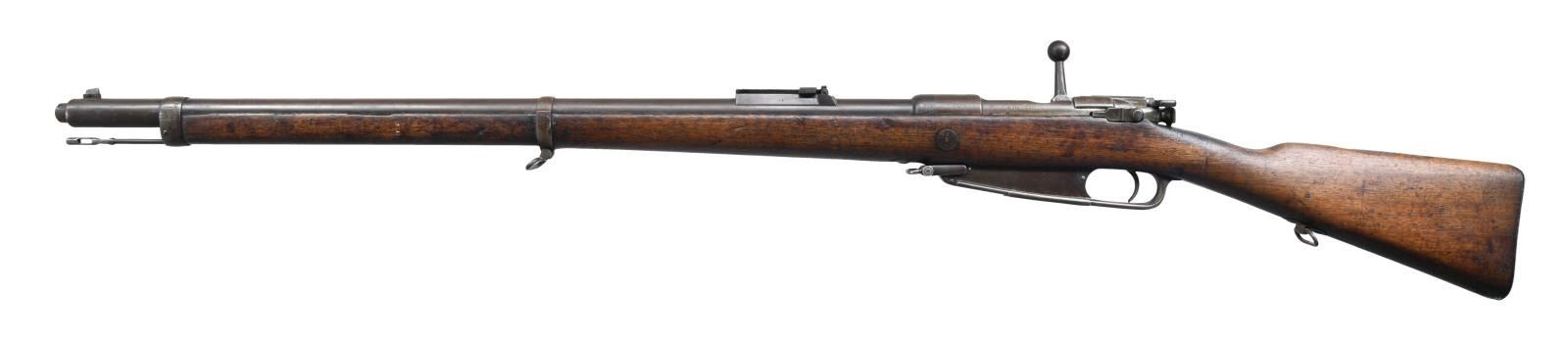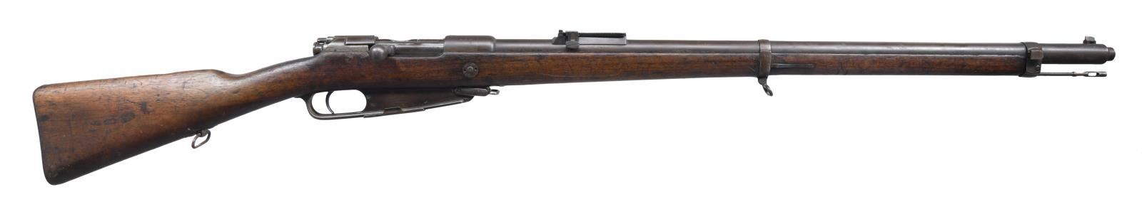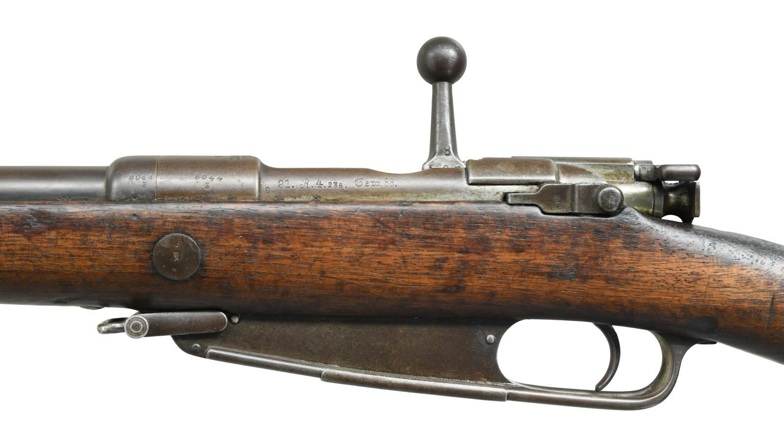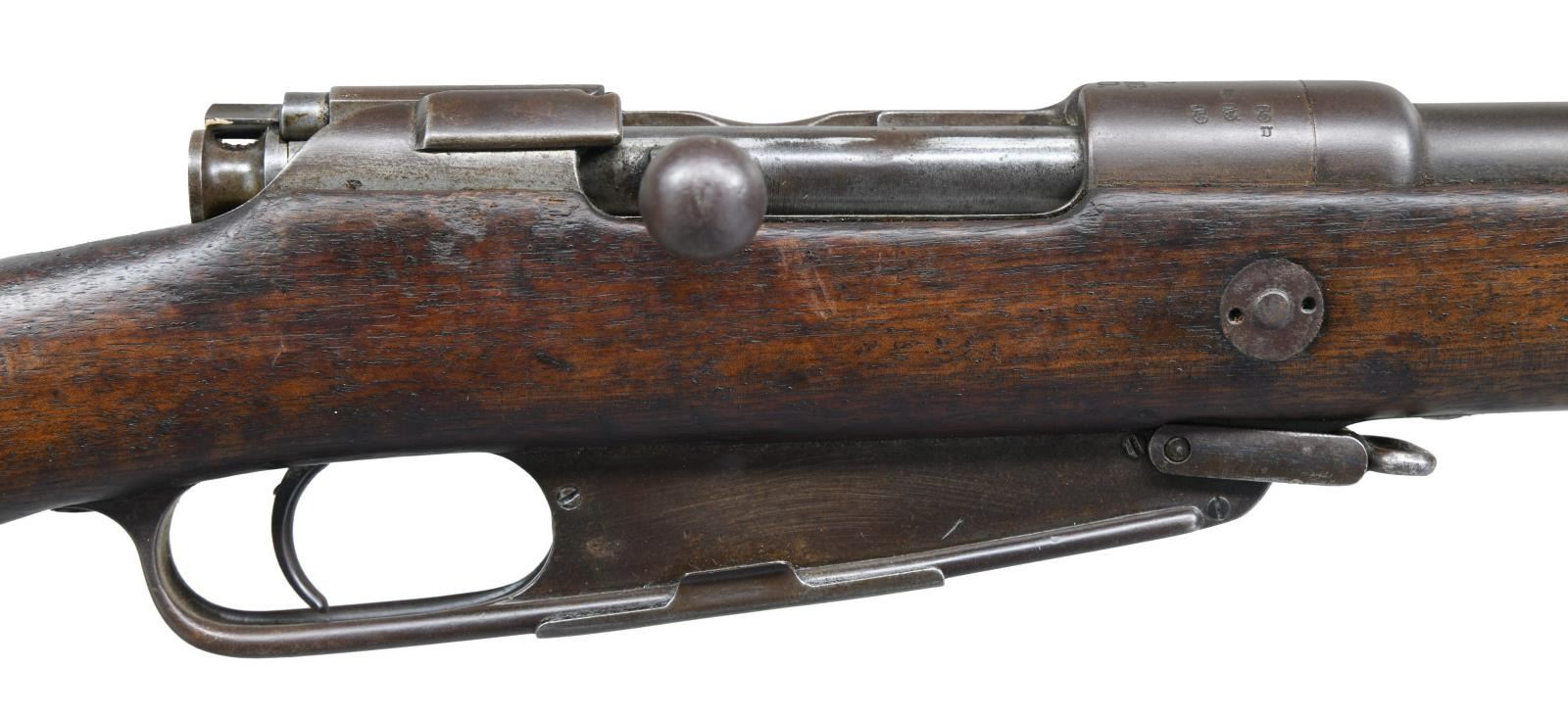 Cal. 8mm Mauser. S# 5044z. Bbl. 30". Stripper clip updated Gew 88 provided to Ottomans as war aid. Later reworked by Turkish government. Matching numbers on bbl & front sight. shroud. Other visible numbers are mismatched. Back half of bolt has Turkish Crescent moon markings. Right side of receiver marked w/ four Imperial German inspection stamps. Top of receiver marked w/ Imperial crown & "DANZIG/1890". Right side of receiver has unit marking that reads "21.R.4.328" for 21st Reserve infantry regiment. Ladder rear sight w/ Turkish graduations. Blade front sight. Walnut stock set w/ bottom mounted sling swivels & additional QD swivel on mag. Cleaning rod present. CONDITION: arsenal reworked stock shows a few chips, a notable abrasion on comb, a small crack behind lower tang, scattered dings & handling marks. Metal turning brown w/ scattered pitting & oxidation. Fair bore w/ scattered oxidation & pitting. (01-23745/MJC). ANTIQUE. $300-400.