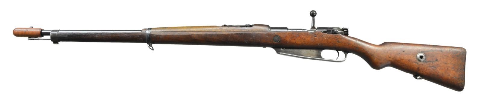 Cal. 8mm Mauser. S #3413. Bbl 29". Rear sight has a matching number but other parts are mismatched. This rifle started life as a Gew 88, it was updated by the Germans to 88/05 configuration, then given to the Ottomans during WW1. It was later reworked by the Turkish republic to its current configuration as an 88/05/35 to more closely resemble the Mauser 98s of the time. Receiver ring is marked with a crescent moon and "TC EAS.FA.ANKARA 1936". The side rail has Turkish S #3413 & most of the old German "Gew. 88" markings. Rear sight graduated to 2000m. Inverted V front sight. Hardwood pistol grip stock has takedown disc. Cleaning rod present. UNATTACHED ACCESORIES: large wooden muzzle cover. CONDITION: hardwood stock shows a chipped area between bands on right side, scattered handling marks & dings. Metal retains 60% arsenal reworked blue with magazine body fading to gray, light pitting on bottom of magazine, some freckling on Bbl. & scattered fading. Fair bore showing scattered frosting & light pitting. (22-2545/MJC). CURIO. $150-250.