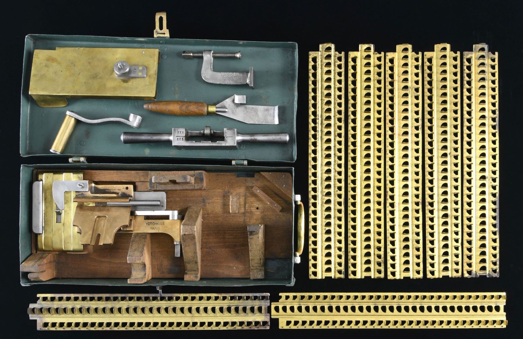 The French Army did not have an advanced machine to fill their feed strips for the Hotchkiss Model 1914, due to the large rim of the 8mm Lebel round. The Turkish Army had a variant chambered in 8mm Mauser, and utilized this dedicated filling machine to simplify the task. They were manufactured by Hotchkiss for export to Turkey. It resides in its original steel chest, measuring approximately 17.75" x 8.5" x 3.75". The chest utilizes a pair of brass hinges in the rear w/ a brass hasp at the front, and a folding brass handle on 1 side of the chest. The loader used a hardwood base that was clamped to a desk or bench & an assortment of steel & brass hand tools to fill the strips. It even includes a resizing tool to straiten the strips when necessary & to realign the fingers that hold the cartridges in place. To load feed strips, cartridges were pre-loaded on 5 round stripper clips & loaded into the cartridge placement tool. The feed tool would hand off the rounds into the cartridge feed guide where they were forced down, and into the feed strip. MAGS: 7 brass feed strips. CONDITION: Kit appears to be completely functional. It is quite amazing for a machine gun accessory of this vintage to be so complete and in such nice condition. The brass parts have a light, time earned patina & the steel parts still have a smooth finish w/ very little staining. PROVENANCE: From the Lifelong Collection of Brian Linde. (02-23926-2/JZ). MODERN. $300-500.