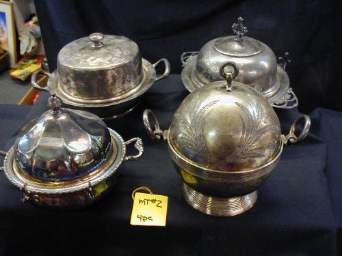 TURN OF THE CENTURY SILVER PLATE BUTTER DOMES INCLUDES (2) ENGRAVED W/FLORAL, PAIRPOINT #2035, ___IEP DAM #603, TOWLE #2002 C. 1900, ALL W/ KNIFE REST, 4 PCS