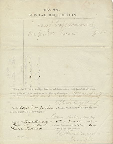 (1828 - 1862) Confederate brigadier general of cavalry in the Shenendoah, under the command of Stonewall Jackson. Killed leading an infantry charge at Harrisonburg, Va. while exhorting his men to follow. War-date D.S. "Turner Ashby", 1p. 4to., Martinsburg, Mar. 5, 1862, a requisition for a pistol holster signed by Ashby as commanding officer. Ink a tad light as is common in these documents due to use of "adversity" ink, else very good.