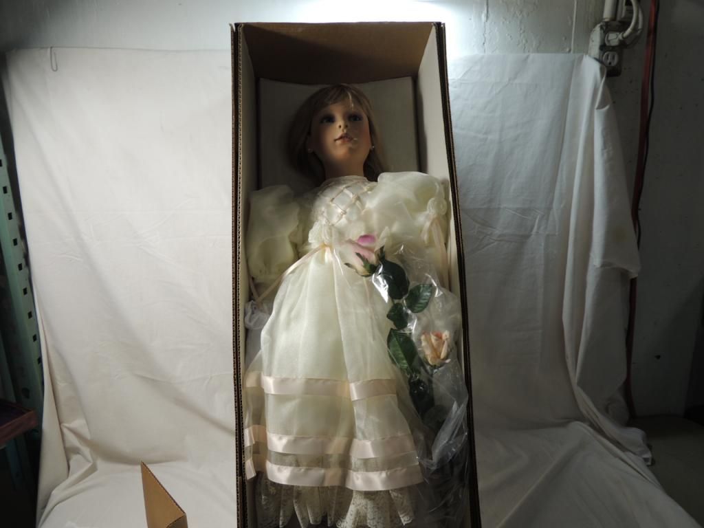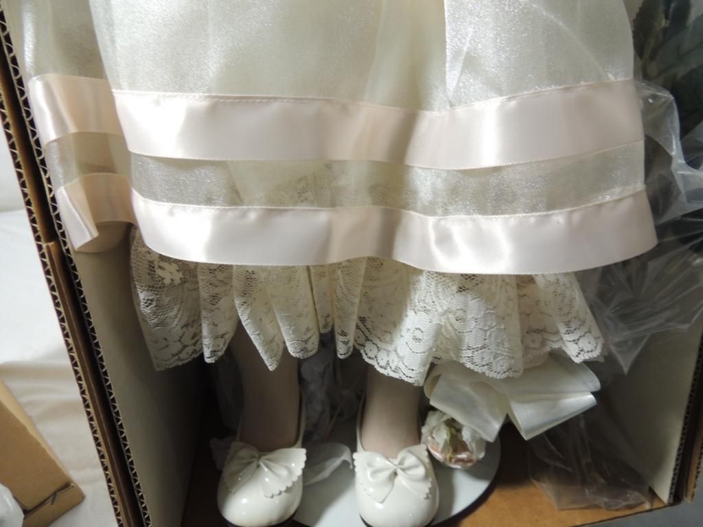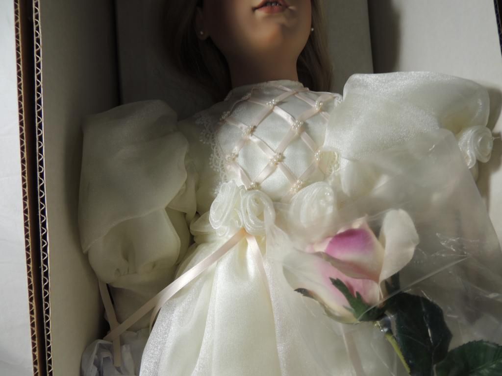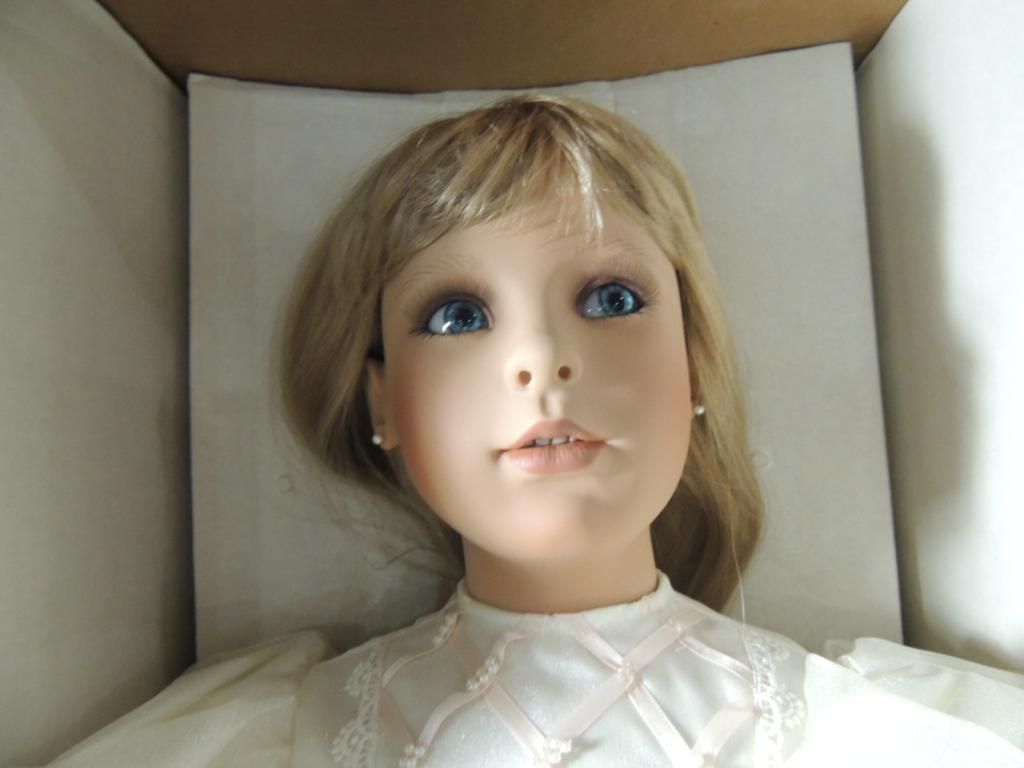 #5/450 SHE HAS BLONE HAIR AND BLUE EYES "LUCINDA" BY VIRGINIA EHRLICH TURNER. IN ORGINAL BOX. CREAM AND PEACH DRESS WITH ROSES. 33" TALL AS SHOWN SEE PHOTO FOR MORE DETAILS