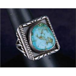 Lot 158 TURQUOISE AND SILVER NAVAJO STYLE RING Shaped flat stone relief set in a square notch framed setting. Unmarked, probably sterling. CONDITION: Good. 8-87075