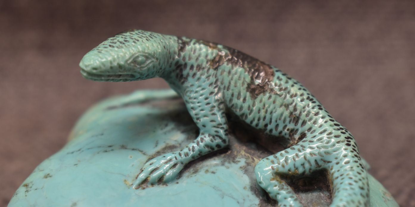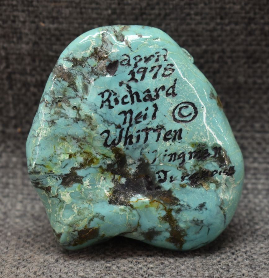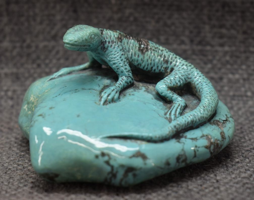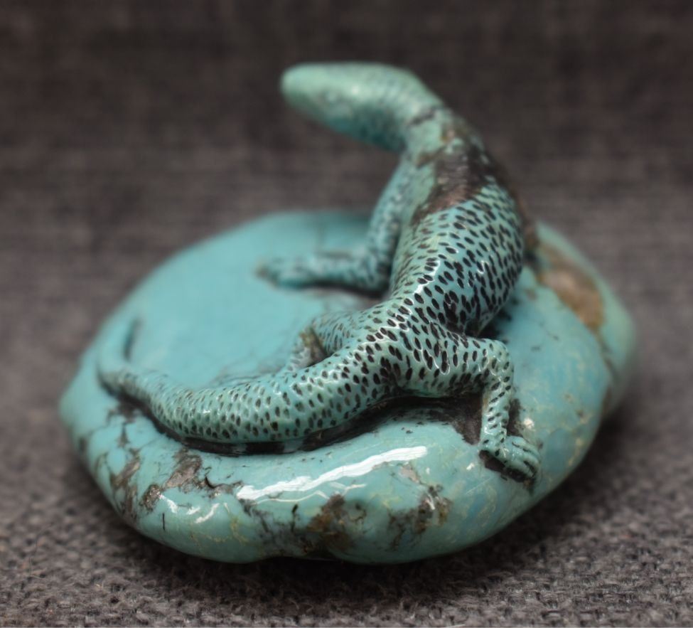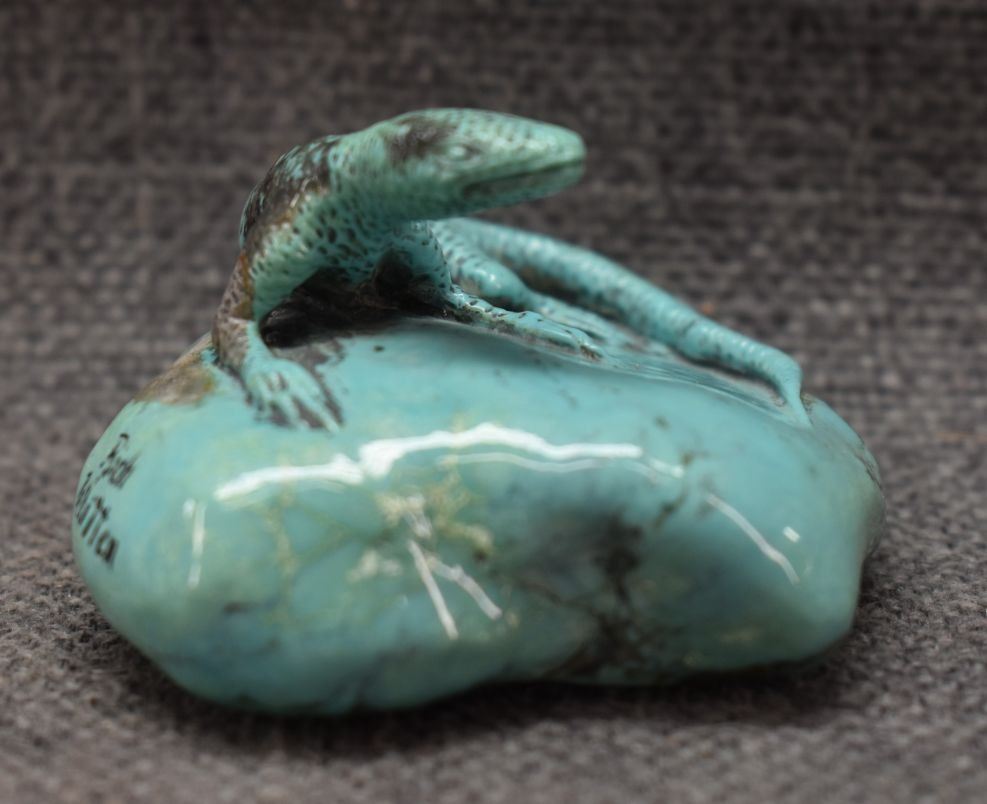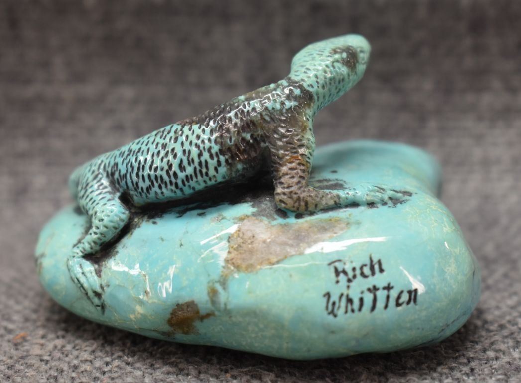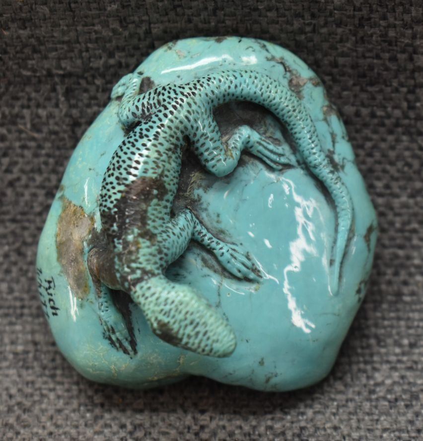 1978, carved lizard on Kingman turquoise by Richard Neil Whitten 1.5" x 2.5" x 2.25" total weight 107 grams