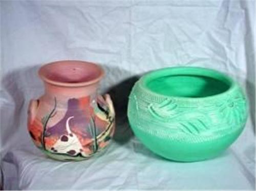 TURQUOISE CLAY BOWL 9"X8" AND HANDPAINTED CLAY POT WITH DESERT SCENE AND TWO HANDLES, SIGNED "MEXICO" 9"X8".