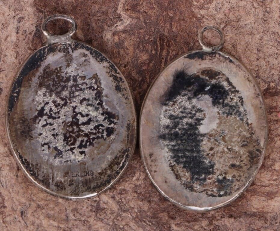 Turquoise and coral sterling silver cut-out Indian head face and bell pendants.