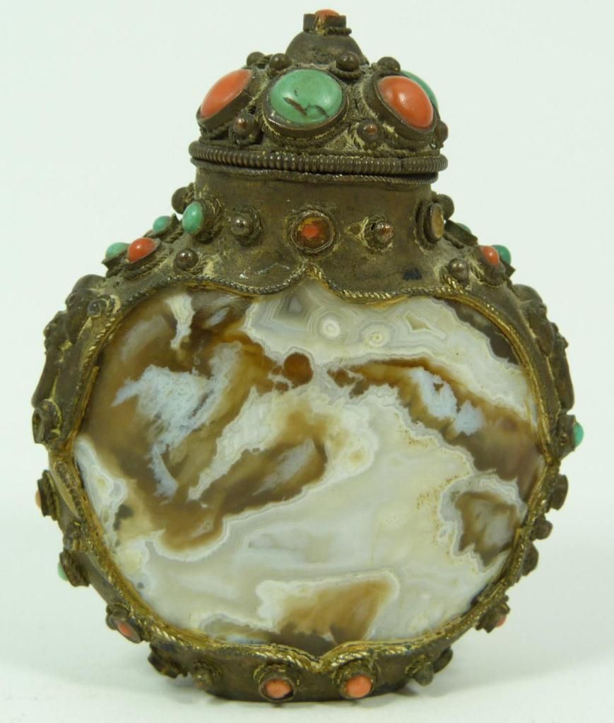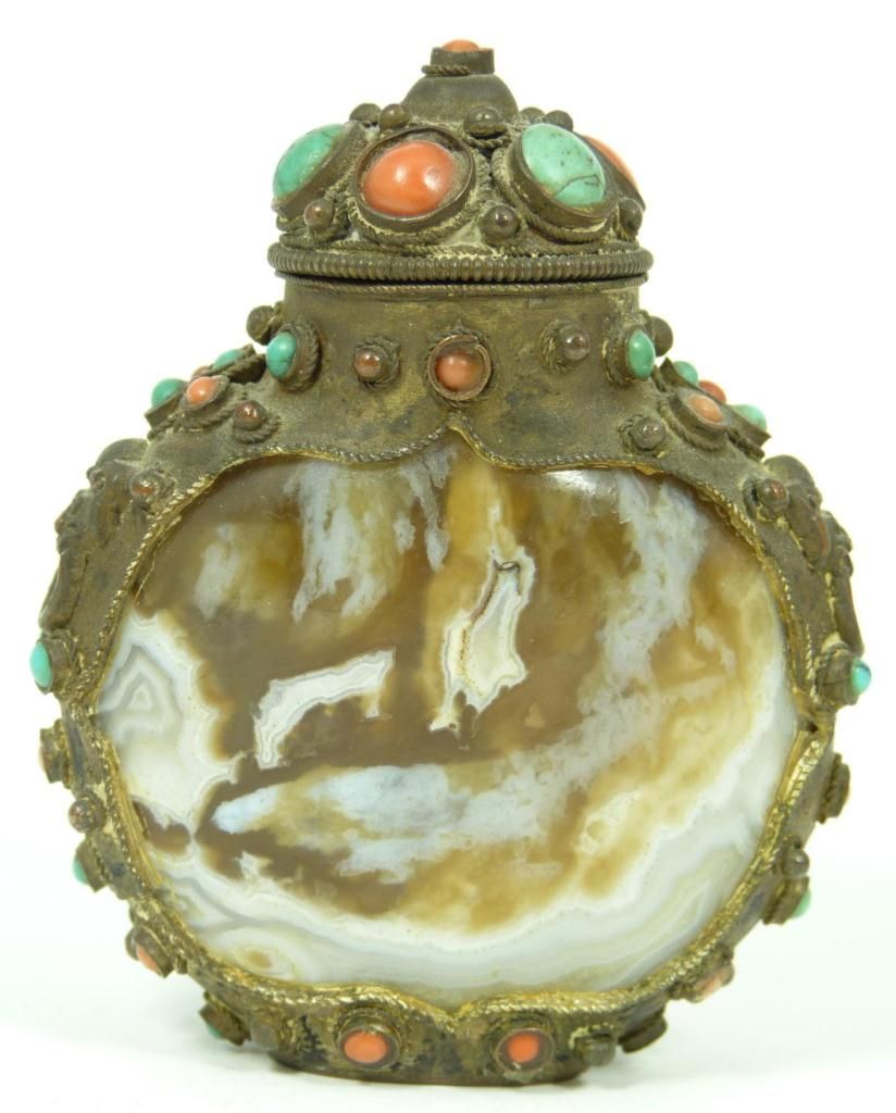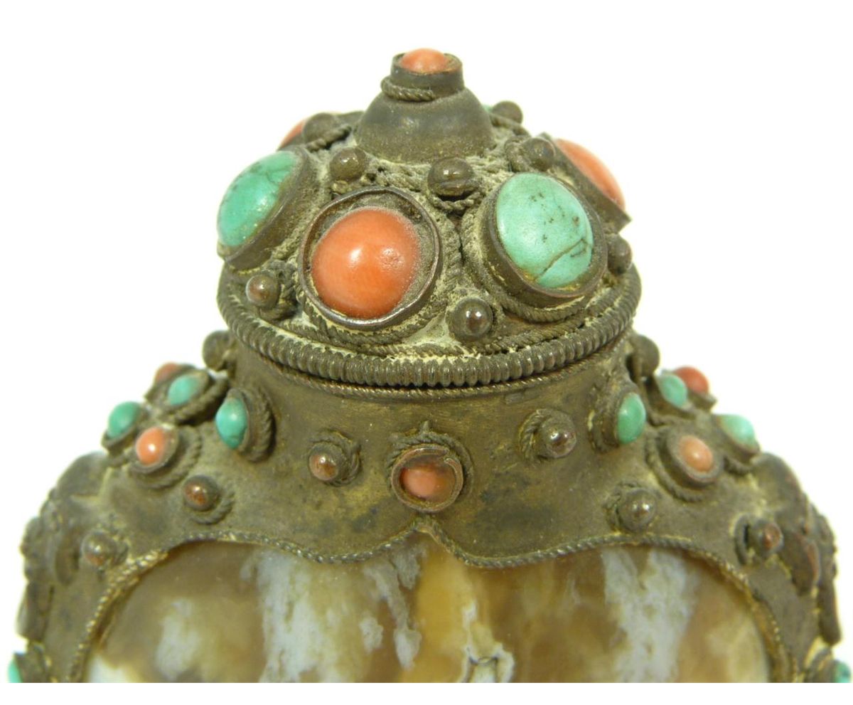 Stone snuff bottle clad with bronze and set with turquoise and red coral beads thorughout. Measures 3 3/8" height (8.5cm). Total weight of 108 grams.