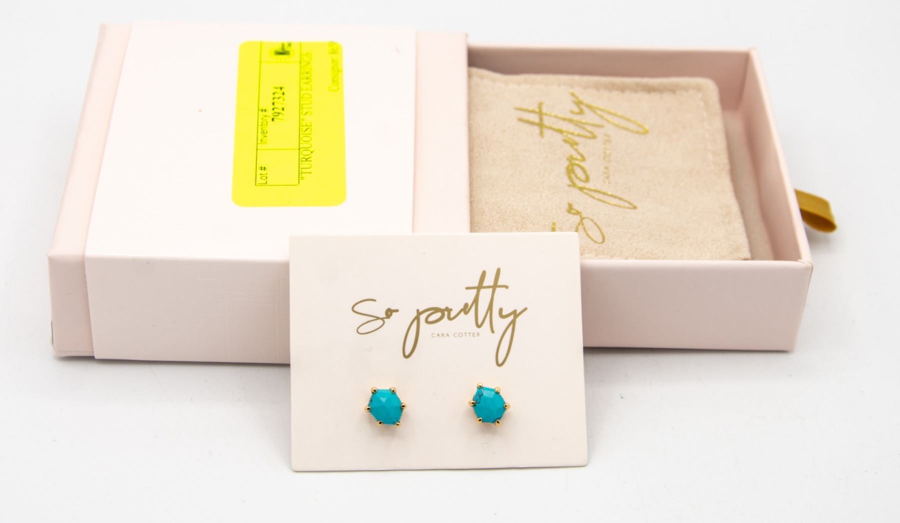 STUD EARRINGS WITH "TURQUOISE" STONES. BOUGHT FROM EDMONTON JEWELLERY STORE, BY CARA COTTER. EARRINGS WERE PART OF MINI HONOUR STUD COLLECTION. THE STONES ARE SET IN 18-KARAT GOLD-PLATED VERMEIL OVER SOLID 925 STERLING SILVER. EARRINGS MEASURE APPROX. 9 X 7 MILLIMETRES. COMES WITH BOX, DUG BAG AND CLEANING CLOTH **ALL ITEMS MUST BE REMOVED BY 5PM SATURDAY, JANUARY 28TH 2023. **ALL REMAINING ITEMS WILL BE SUBJECT TO A $6.00 PER DAY STORAGE CHARGE. ANY ITEMS REMAINING AFTER MONDAY, FEBRUARY 13TH, 2023 WILL BE CONSIDERED FORFEITED. NO REFUNDS WILL BE ISSUED FOR FORFEITED ITEMS. TO SCHEDULE A PICK UP APPOINTMENT CLICK HERE