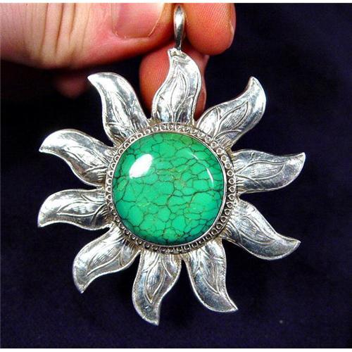 Welcome to Artisan Tribal Gems. All of our showcases feature sterling silver with natural untreated stones. Fabulous handcrafted designs for your purchasing pleasure. Please remember these items are REAL and we guarantee these items to be of the highest quality. This bold pendant is fashioned in the brilliant replica shape of the sun with measurements