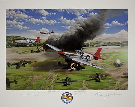 Excellent limited edition color print "Red Tail Fury" by artist A. Ric Druet, 24" x 19", no. 1233/1500, depicts five American Mustang fighters of the 301st Fighter Squadron attacking a German airbase signed in pencil at bottom by the artist and five "Tuskegee Airmen", including CARL E. CAREY, SR. (DFC, Air Medal with 2 Oak Leaves), WALTER M. DOWNS DFC, Air Medal with 1 silver, 2 bronze cluster), ALEXANDER JEFFERSON (Air Medal, POW Medal), HAROLD E. SAWYER, (DFC, Air Medal with 7 Oak Leaves), and HARRY T. STEWART, JR., (DFC, Air Medal with 7 Oak Leaves). Fine, with a brochure with pilot profiles.